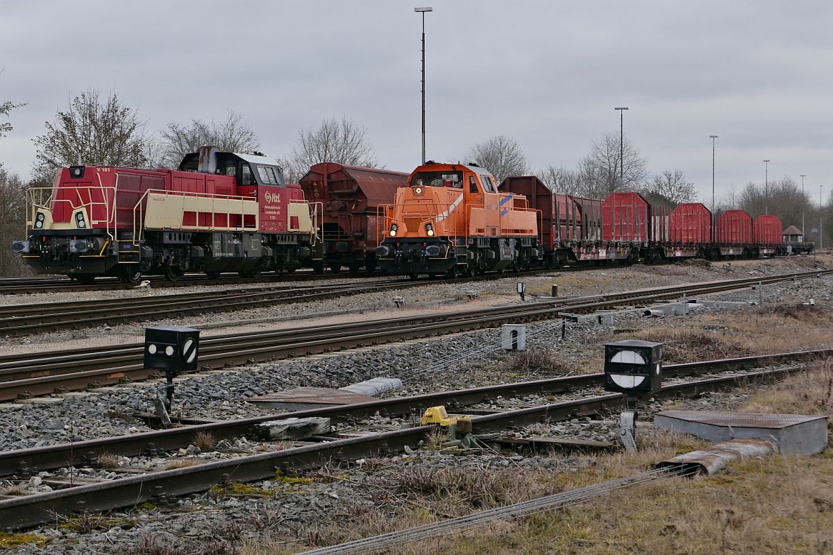 V 181 (92 80 1265 301-2 D-SWEG) der Hohenzollerischen Landesbahn AG und 261 302-4 der northrail (92 80 1261 302-4 D-NRAIL) am 04.02.2022 in Mengen. Aufnahmestandort am Rand der Flachsstraße im Gewerbegebiet. Jürgen Vos