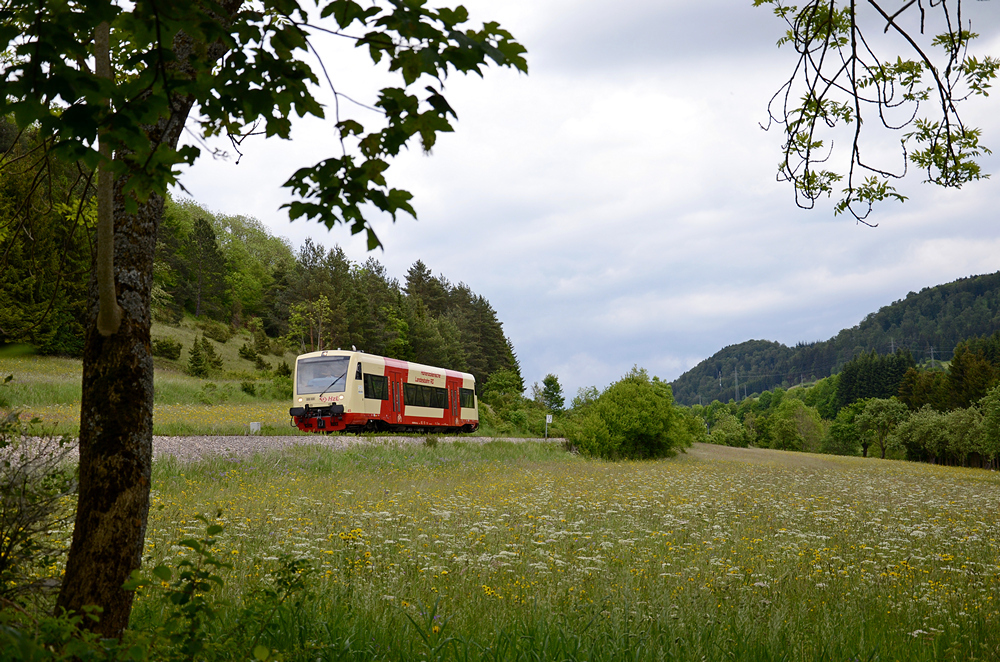 Auf der Stammstrecke der HzL ist am 28. Mai 2014 VT 45 als HzL 86330 unterwegs. Er hat vor kurzem Burladingen verlassen und erreicht in wenigen Minuten Hausen-Starzeln. Bis vor kurzem war der Triebwagen noch in den blau-Gelb - den Farben des Landkreises Tuttlingen - unterwegs. Friederich Rieber
