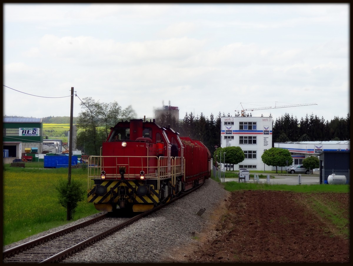 Selten wird er fotografiert... der HzL Salzzug, welcher Montags, Mittwochs und Freitags verkehrt. Er kommt aus Stetten und geht nach Ulm. Am 5.6.13 fuhr der Salzzug aus Stetten mit Holzbeilage aus Hart mit den Loks V150 und V152. Hier wurde der Zug an einem warmen Mittwoch nahe dem Ort Rangendingen aufgenommen. Seegurke