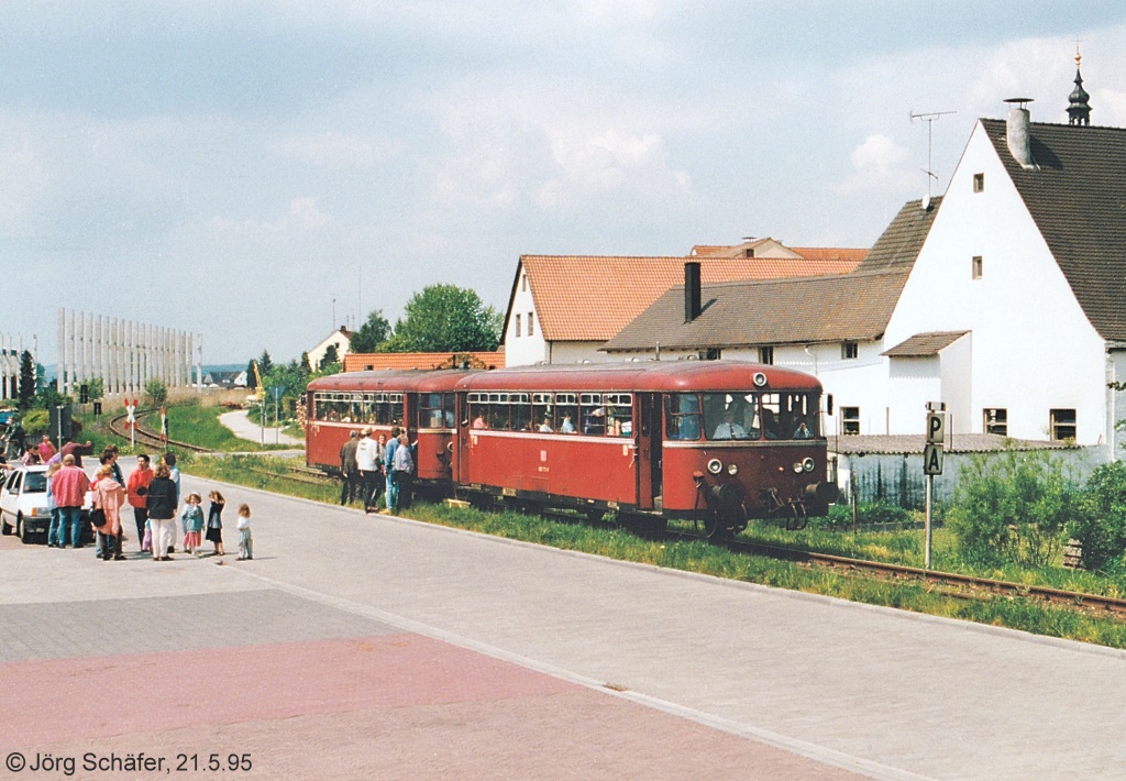 796 724 und 996 773 hielten am Aktionstag "Mobil ohne Auto" in Wachenroth nicht im alten Bahnhof, sondern am Rand eines neu angelegten Parkplatzes. (Blick nach Nordwesten am 21.5.95) Jörg Schäfer