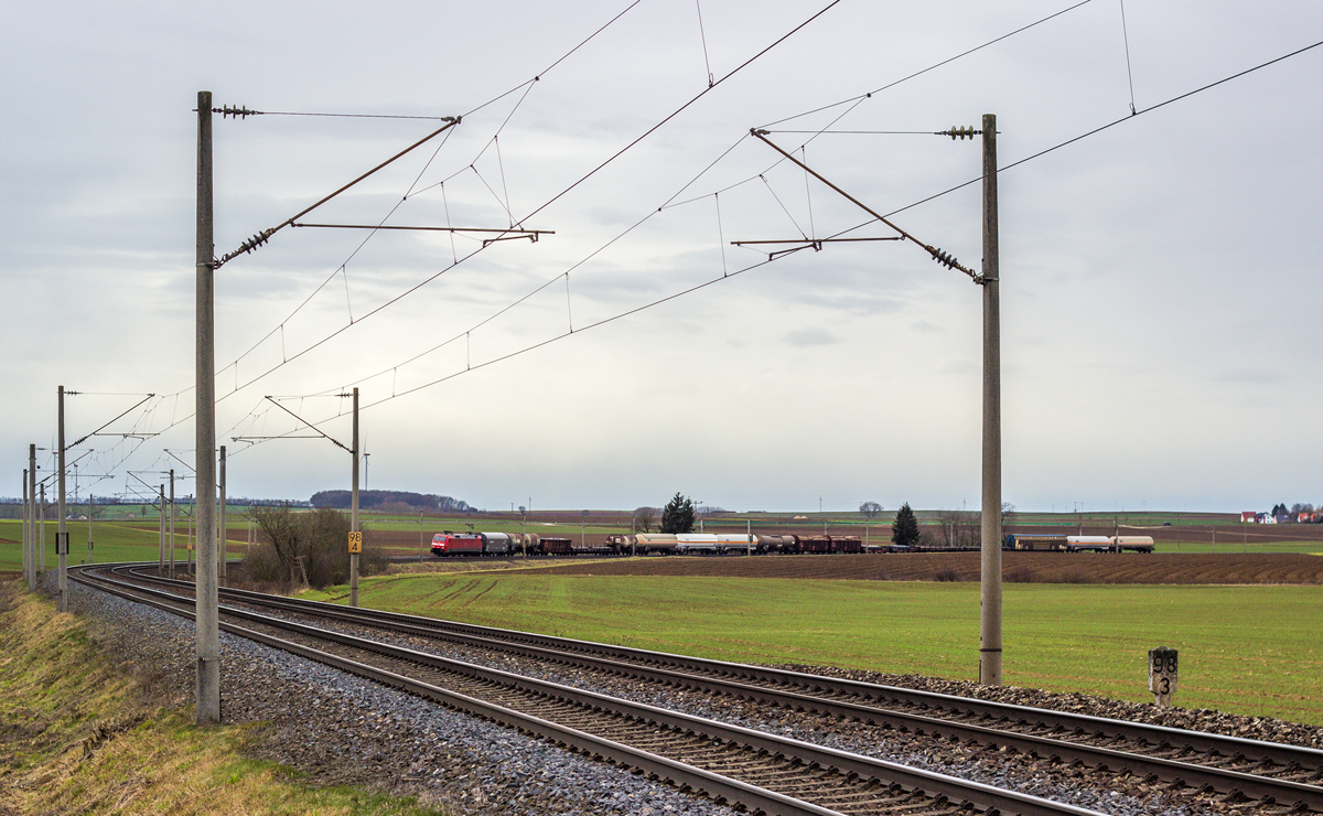 Nach der langgezogenen Linkskurve geht es für 152 063-4 mit ihrem gemischten Güterzug nur kurz geradeaus, bevor die nächste Rechtskurve folgt... Zu sehen gibt es diese dann das nächste Mal, wenn das Wetter wieder stimmt ;) Aufgenommen zwischen Gollhofen und Uffenheim am 08.02.2014 Sebastian B.