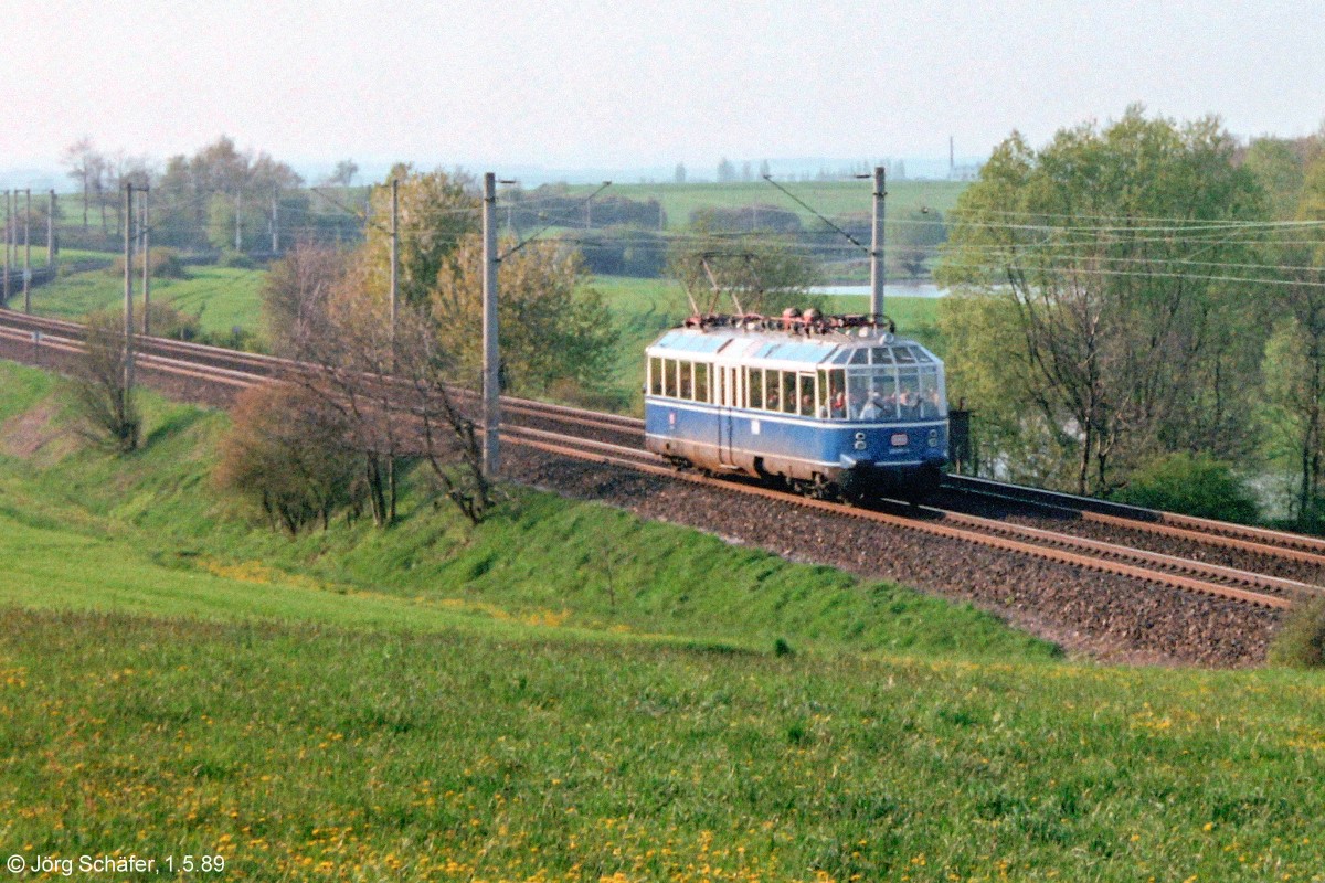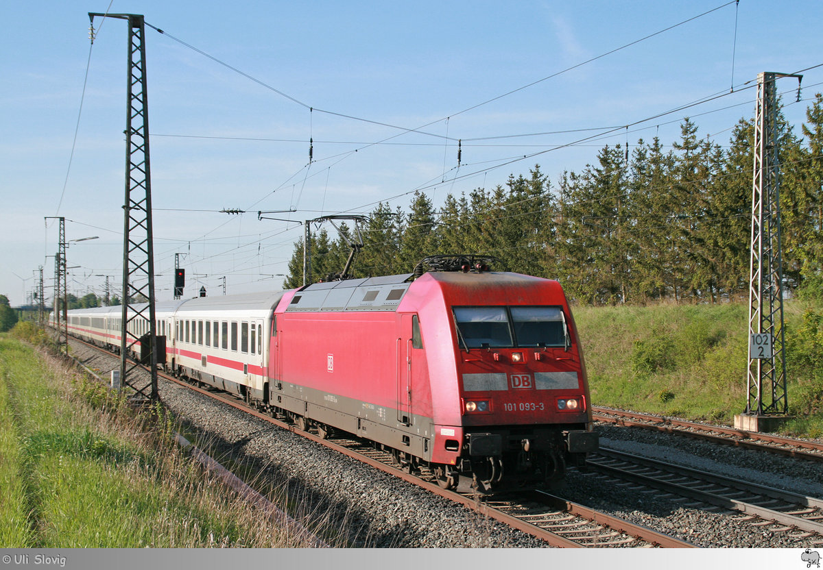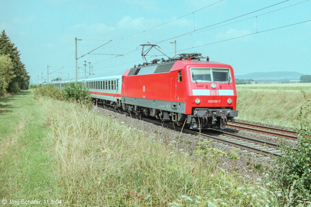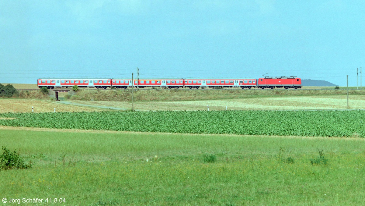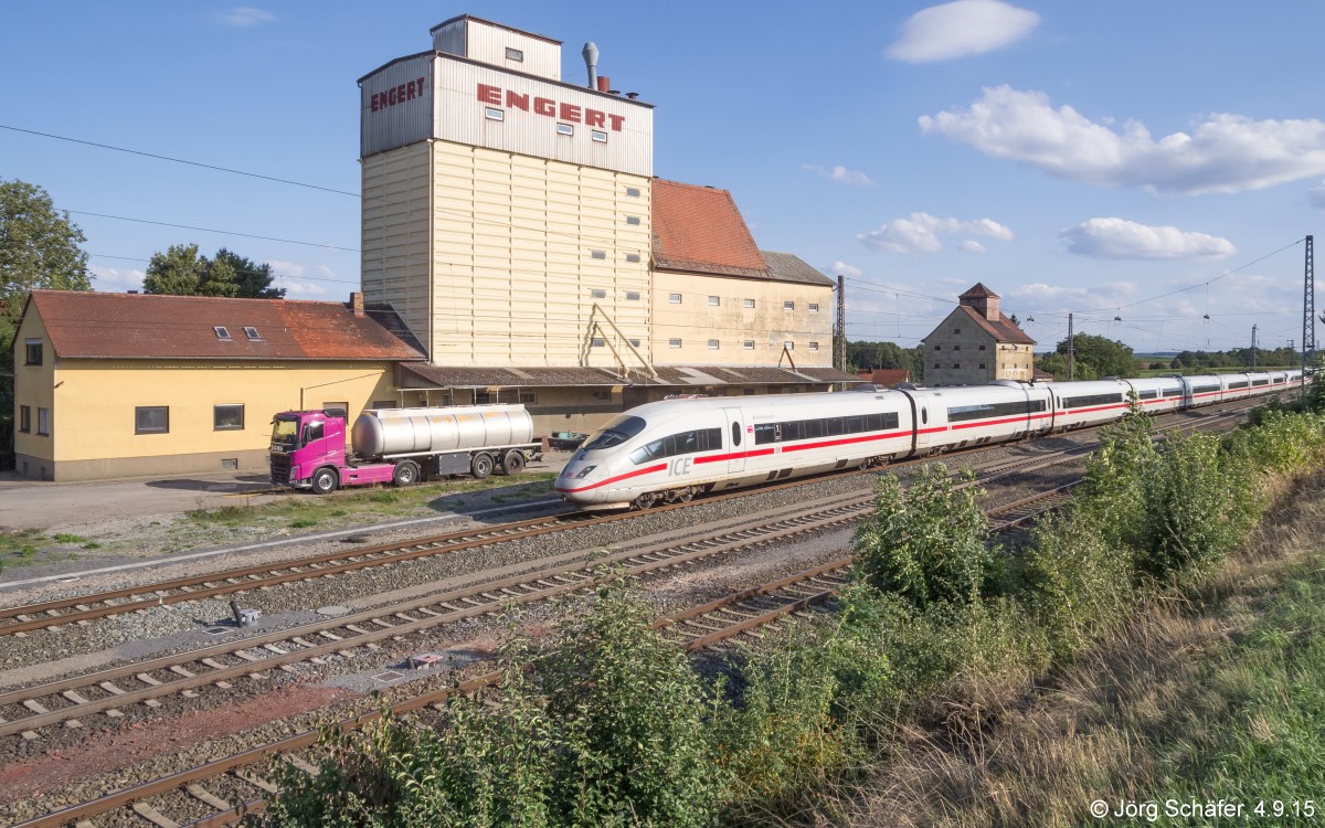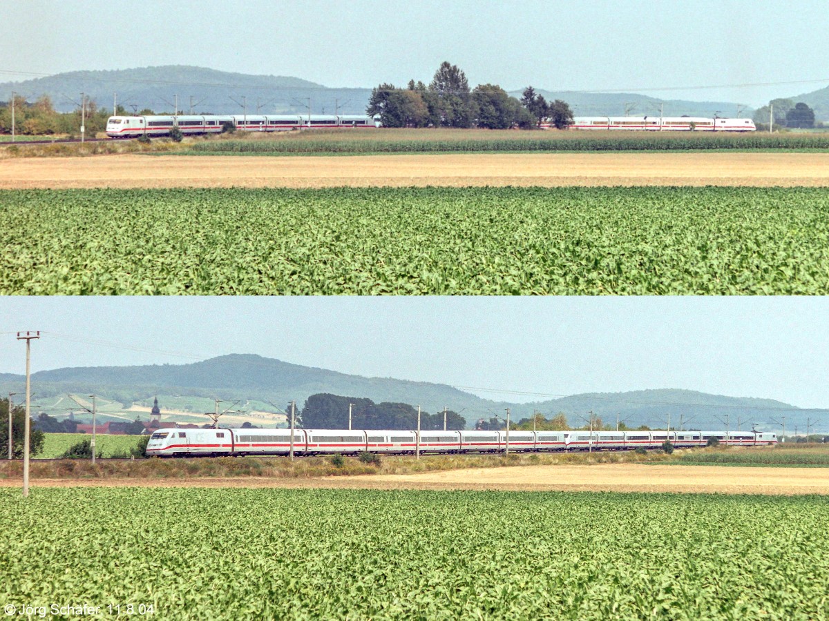 Panorama-Aufnahmen von ICEs im kurvenreichen Abschnitt zwischen Gollhofen und Uffenheim. Im Hintergrund der Kirchturm von Geckenheim. (Blick nach Osten am 11.8.04) Jörg Schäfer