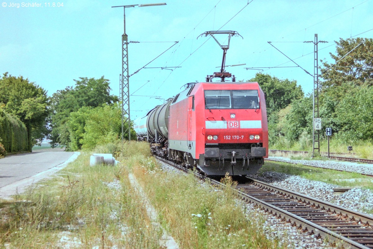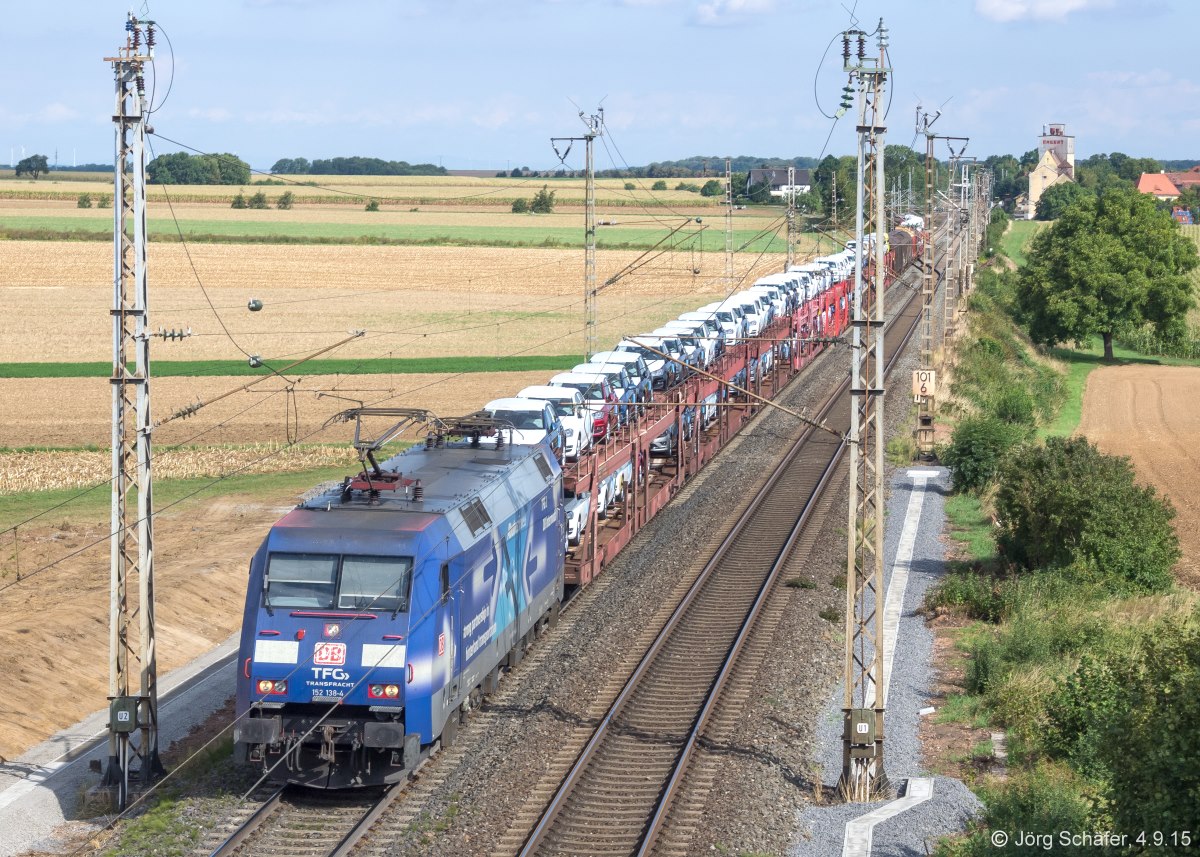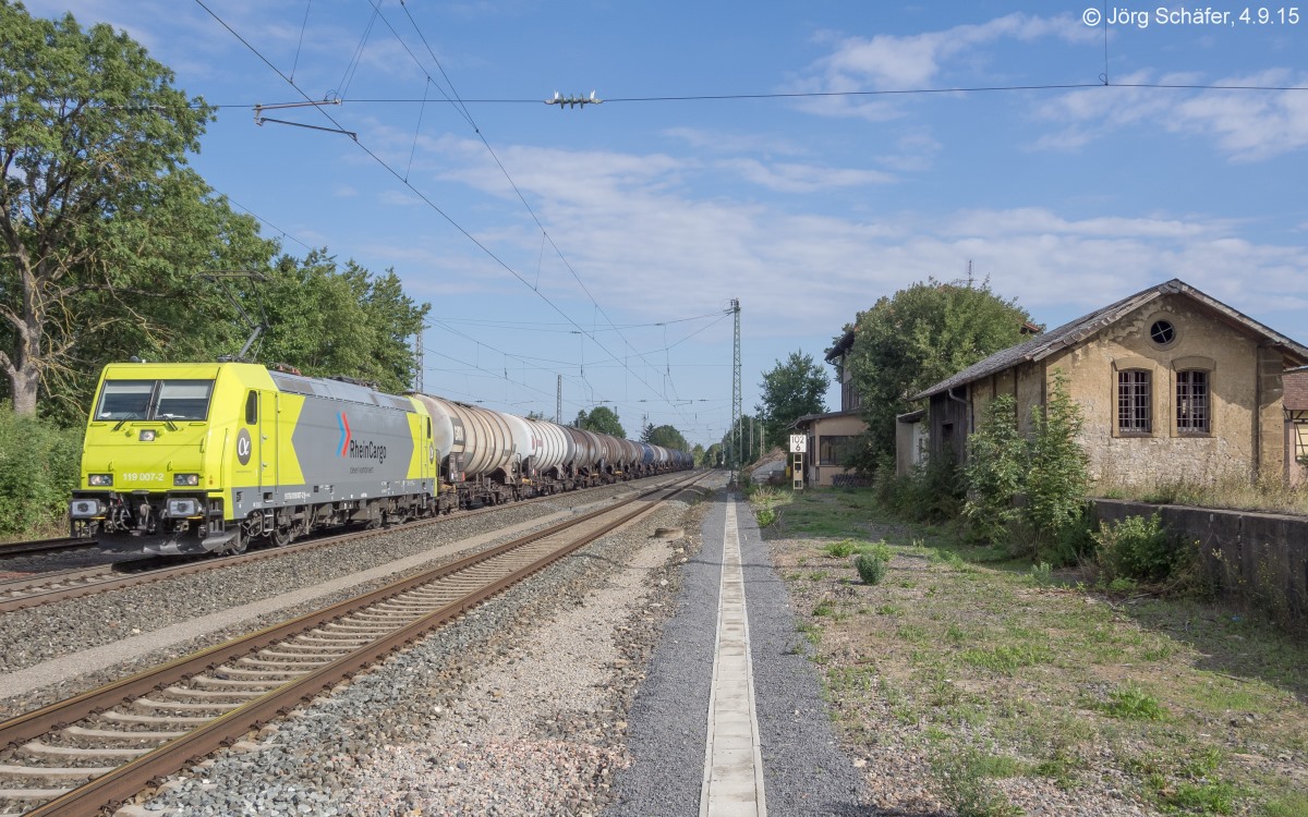 152 138 fuhr am 4.9.15 im Bahnhof Herrnberchtheim aus Gleis 3 ab, weil sie dort mit ihrem Güterzug von einem ICE nach München überholt worden war. Jörg Schäfer