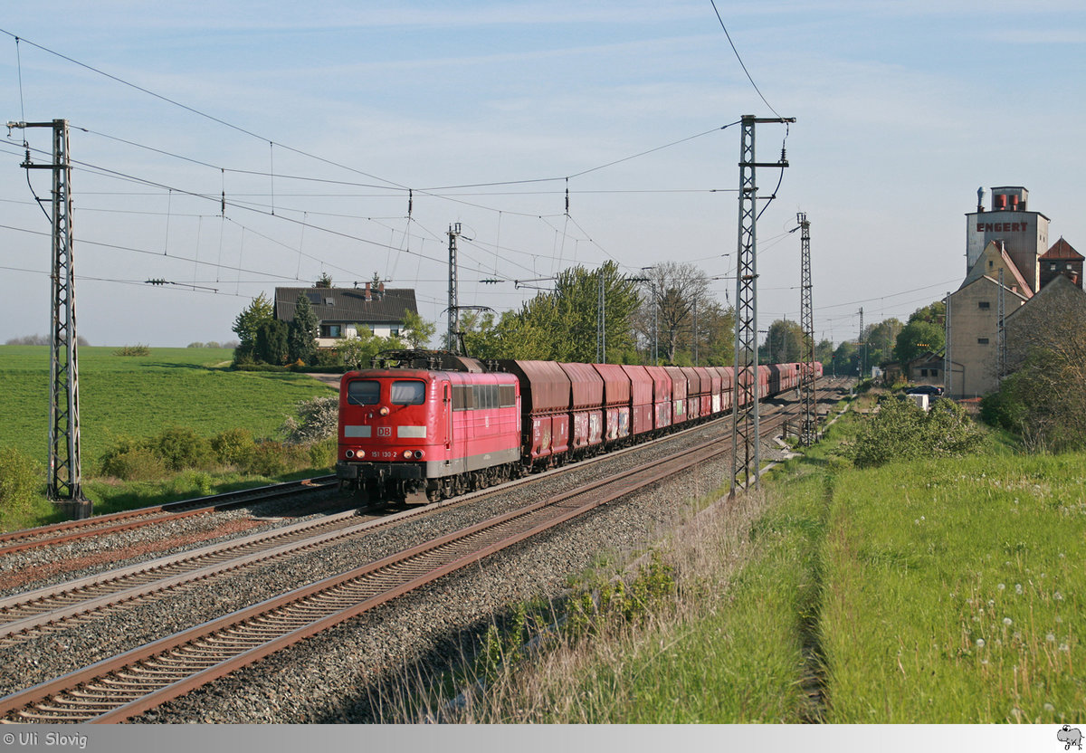 151 130-2 ist auf der KBS 920 am 10. Mai 2017 mit einen Kohlenzug Richtung Treuchtlingen unterwegs. Am Zugschluß schob 151 043-7 nach. Die Aufnahme entstand bei Herrnberchtheim. Ulrich Slovig