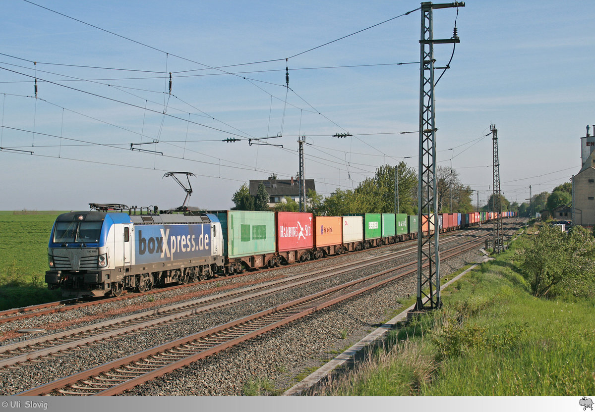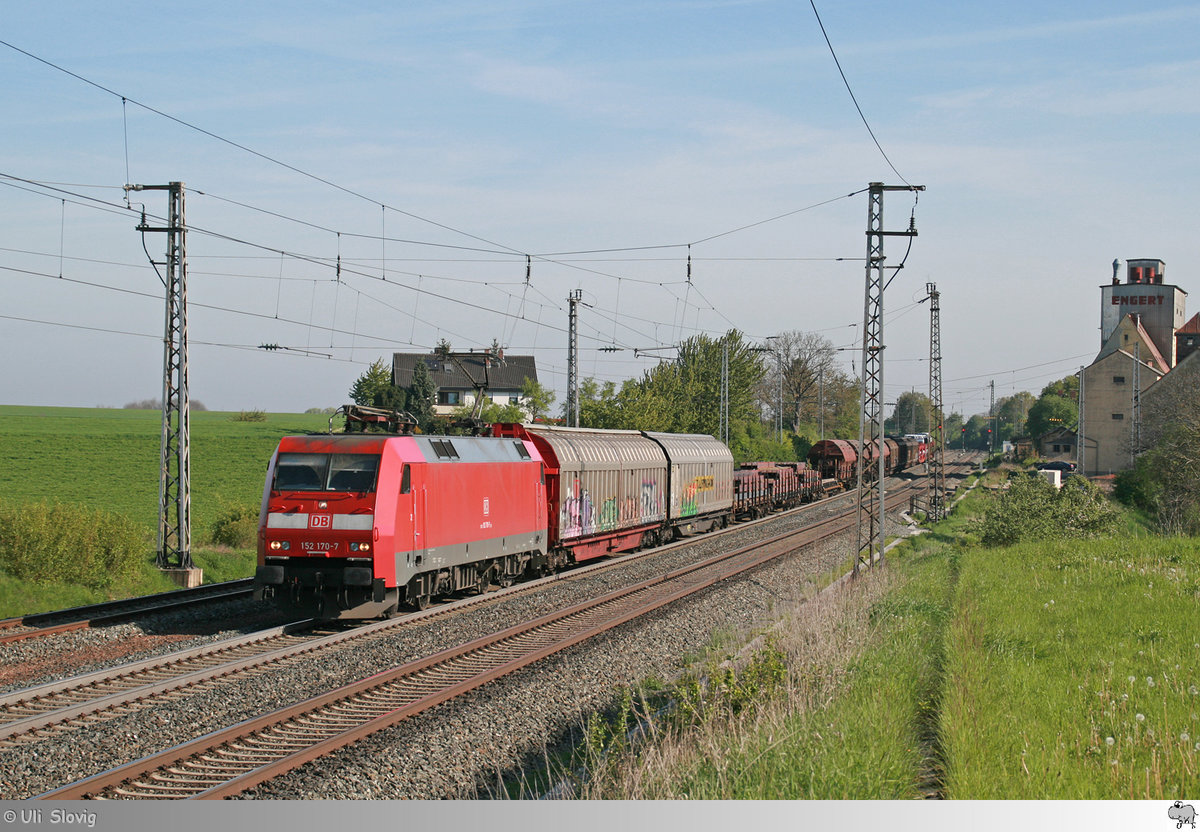 152 170-7 der Deutschen Bahn ist am Morgen des 10. Mai 2017 mit einen gemischten Güterzug bei Herrnberchtheim in Richtung Süden unterwegs. Ulrich Slovig