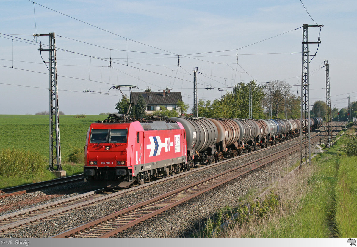 185 587-3 der HGK ist am Morgen des 10. Mai 2017 mit einen Kesselwagen-Ganzzug auf der KBS 920 bei Herrnberchtheim auf den Weg nach Süden. Ulrich Slovig