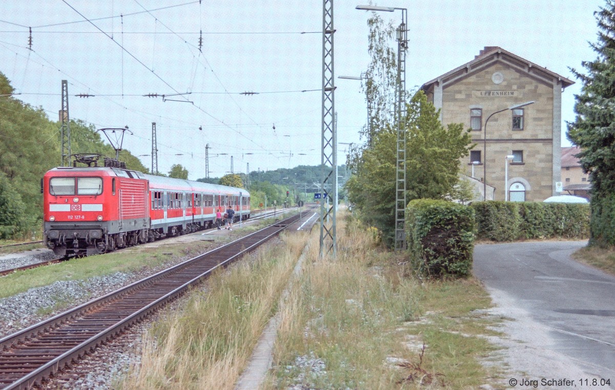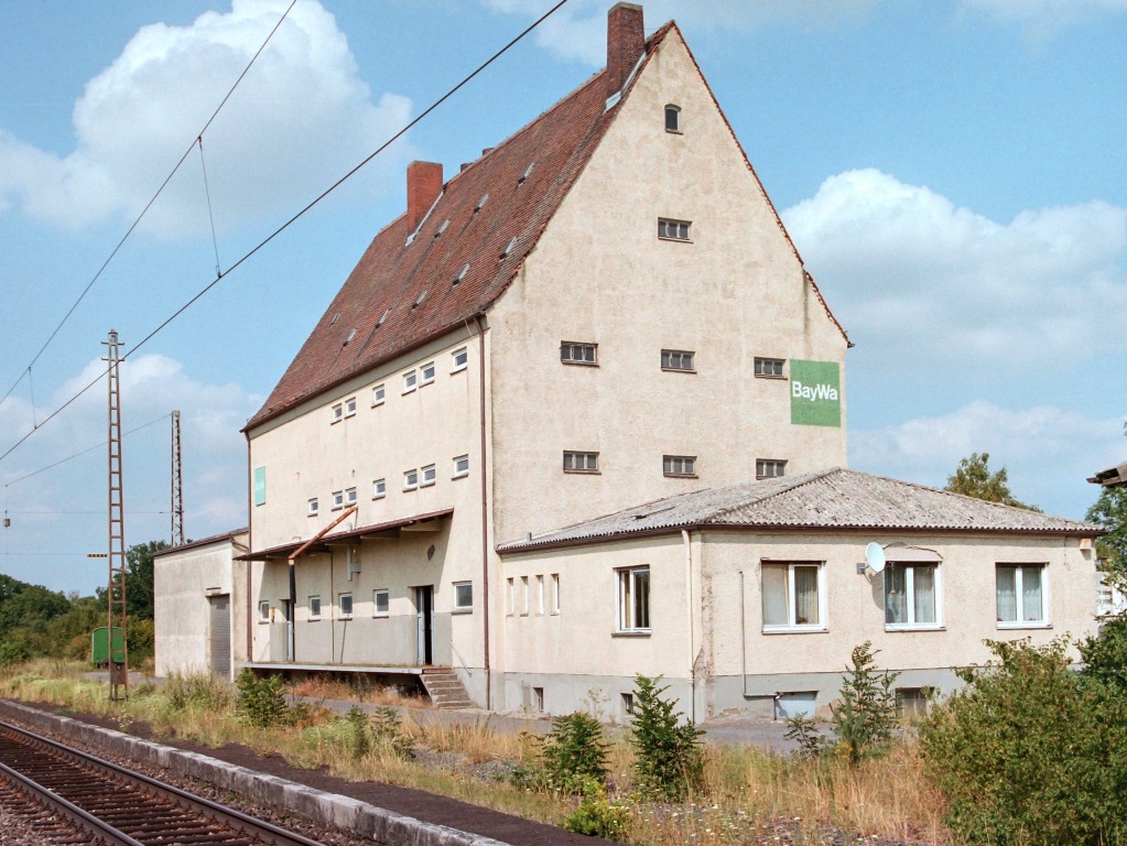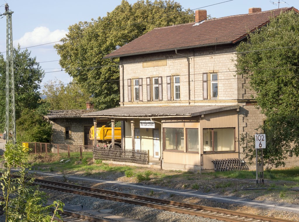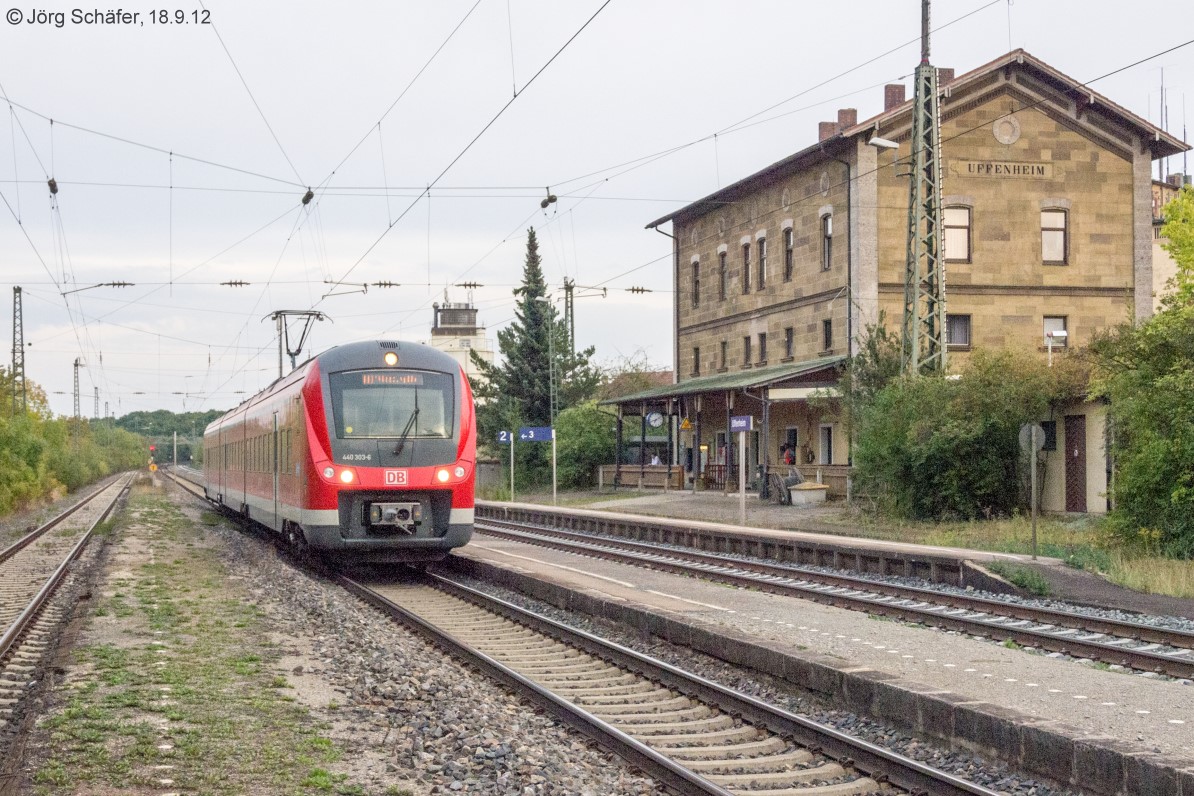 Elf Jahre nach # 985738 fehlten in Herrnberchtheim neben den Sträuchern vor dem Empfangsgebäude auch die Bahnsteige zwischen den Gleisen. (Blick nach Osten am 4.9.15) Jörg Schäfer