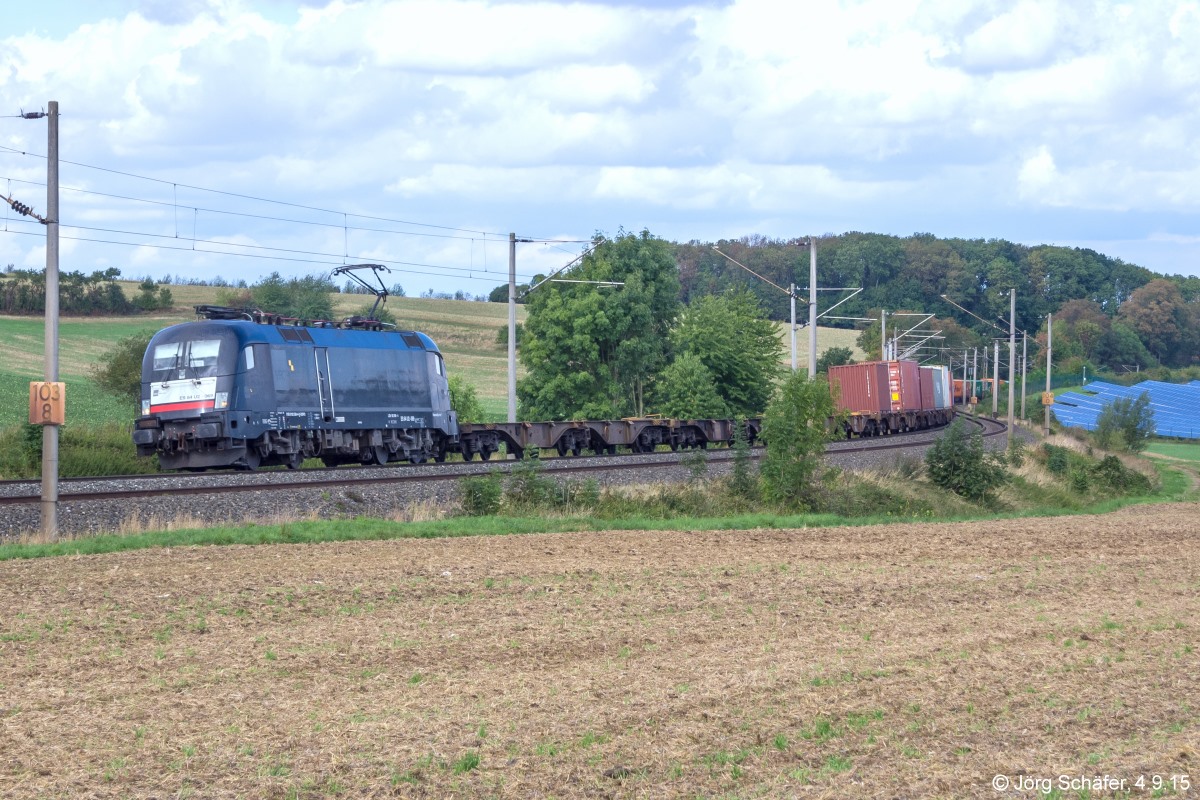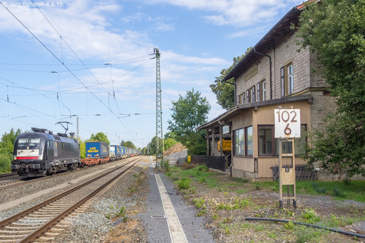 ES 64 U2-062 fuhr am 4.9.15 mit einem RoLa-Zug Richtung München durch Herrnberchtheim. In dem Bahnhof halten schon seit 1978 keine Personenzüge mehr. Jörg Schäfer