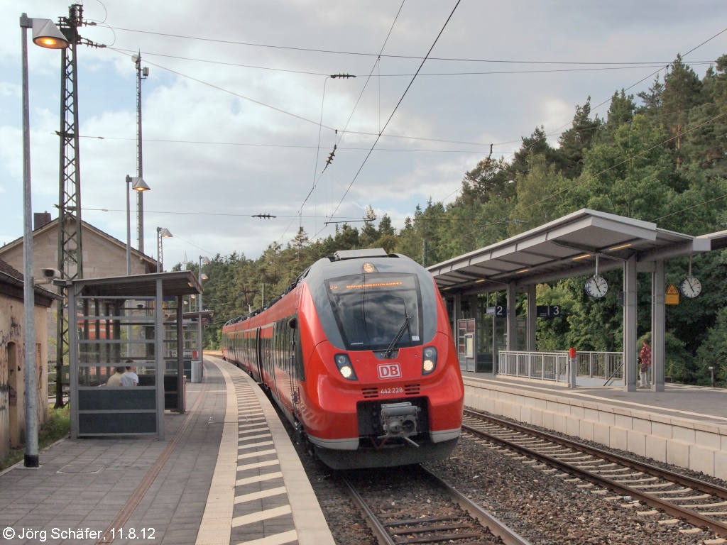 482 039 erreichte am 11.8.12 auf dem Weg nach Nürnberg den Bahnhof Ochenbruck. Die meisten Züge nach Norden fahren durch Gleis 3, weil das Überholgleis in der Mitte liegt. Im Hintergrund erkennt man die dafür notwendigen Y-Weichen. Jörg Schäfer