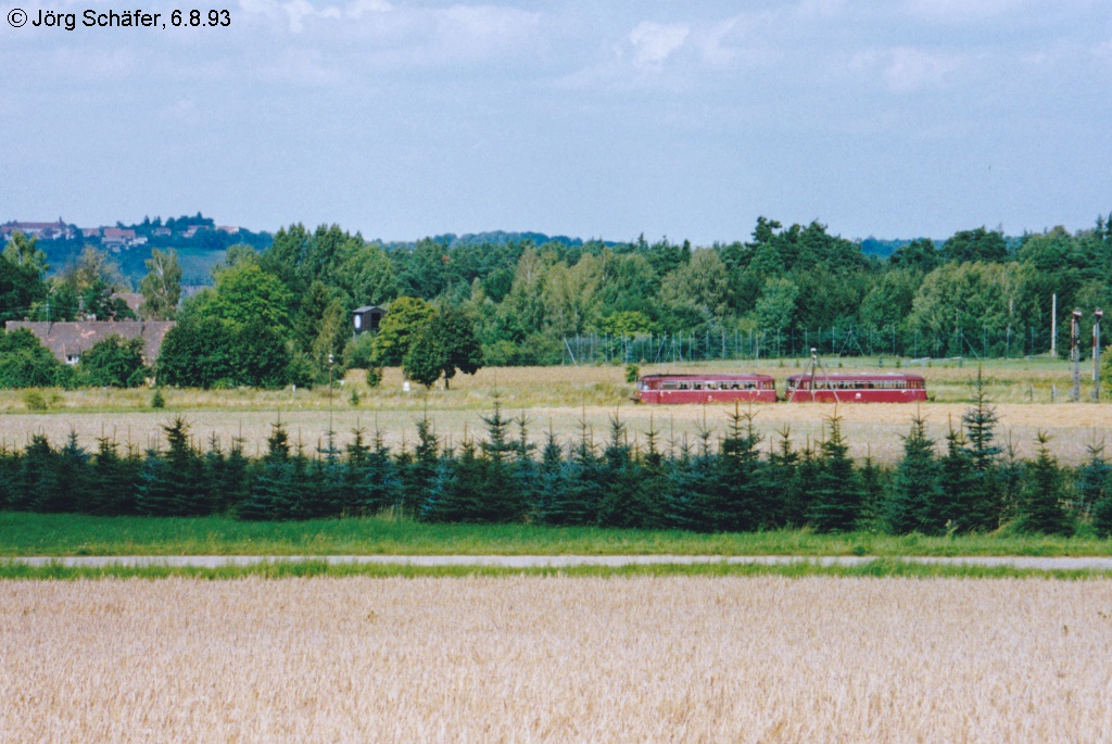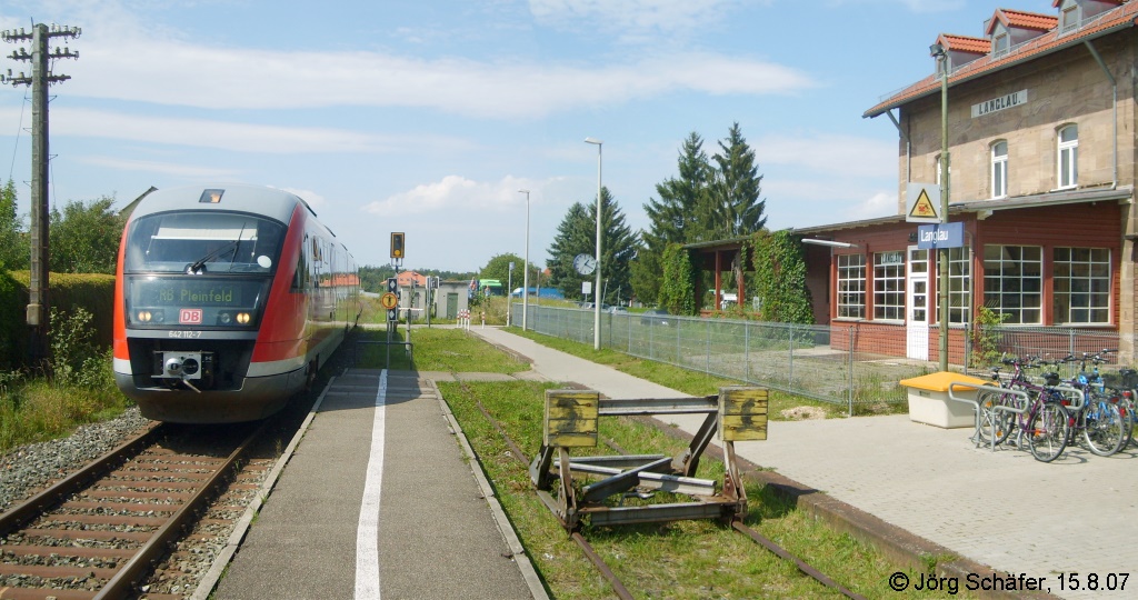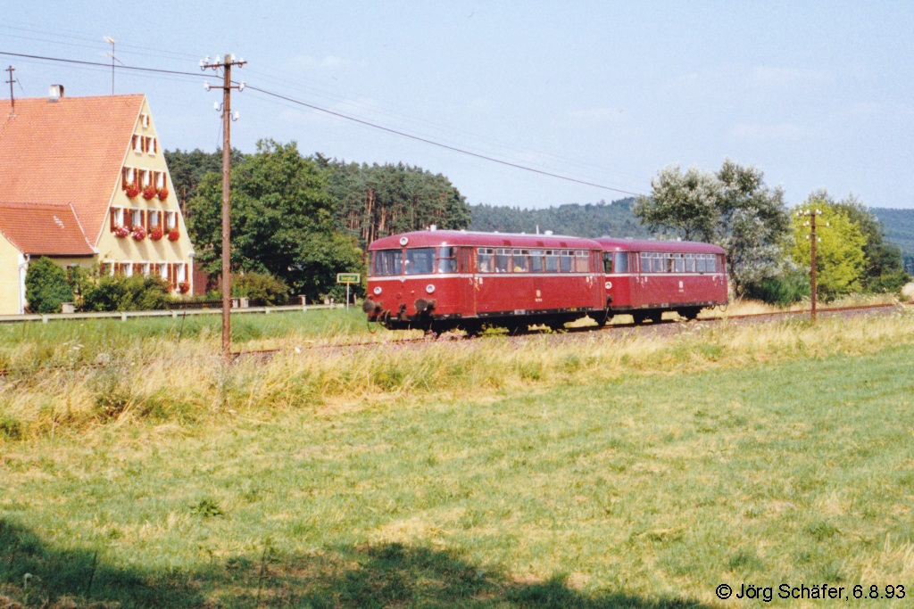 Ein aus Pleinfeld kommender Schienenbus erreicht am 6.8.93 Langlau. Am rechten Bildrand stehen die Ausfahrsignale und links versteckt ist das Empfangsgebäude des Bahnhofs hinter Sträuchern. Jörg Schäfer