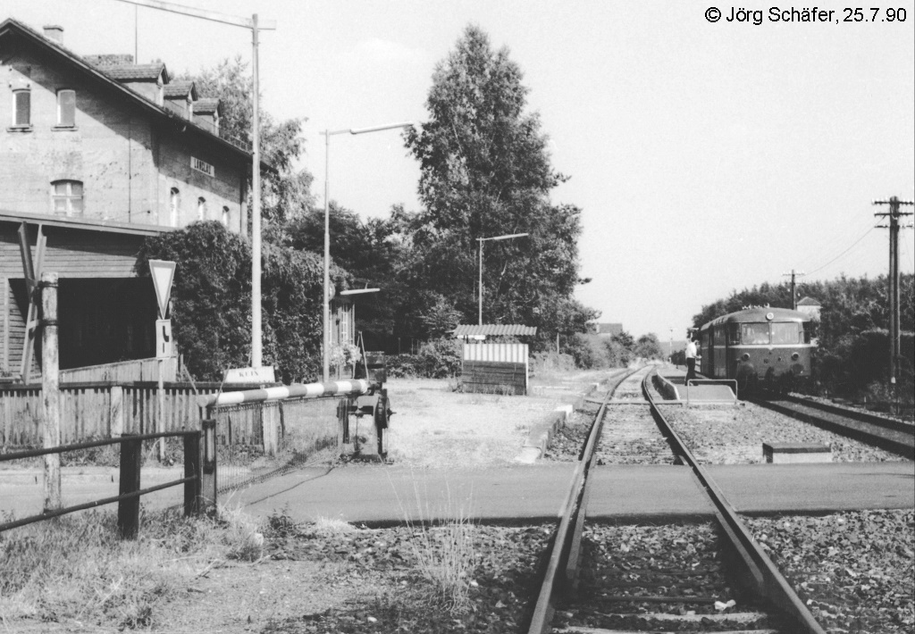 Ein Schienenbus stoppt auf dem Weg nach Gunzenhausen in Langlau. Am 25.7.90 waren alle Signale und Nebengleise im Bahnhof noch weitgehend intakt. Jörg Schäfer