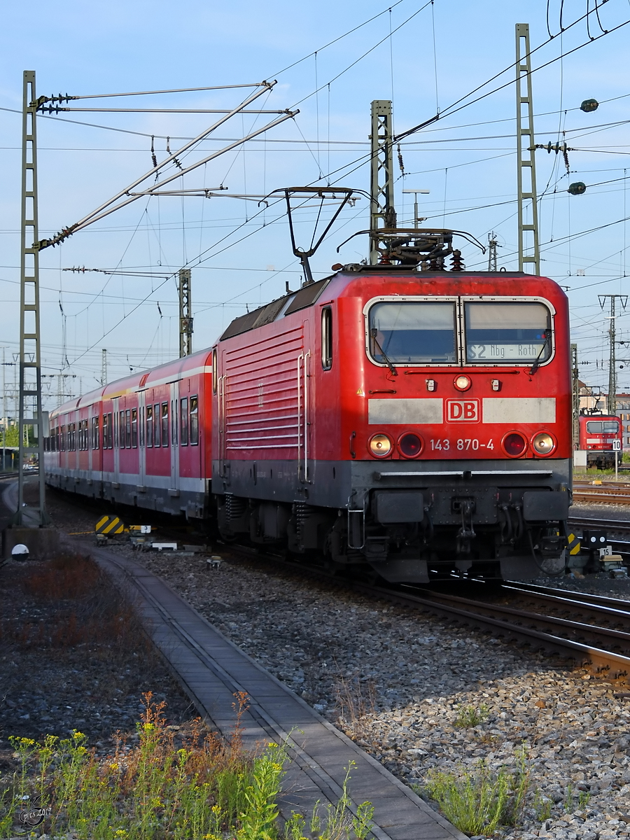 Die Elektrolokomotive 143 870-4, unterwegs auf der Linie S 2 bei der Einfahrt in den Hauptbahnhof Nürnberg. (Juni 2019)