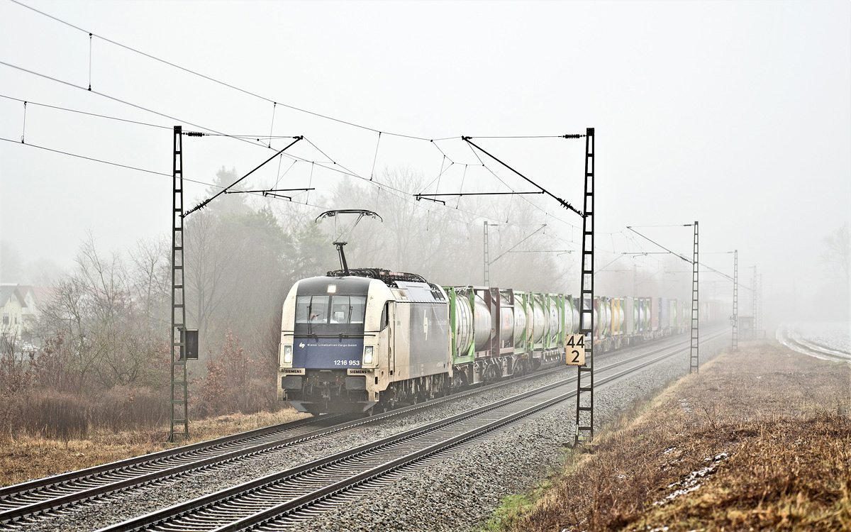 Die Railpool 193 817-4 fährt am 20.1.2018 mit einem mit Ethanol beladenen Kesselwagenzug in Langenisarhofen nach Süd-Viele Grüsse zurück an den Lokführer. Matti Morelli