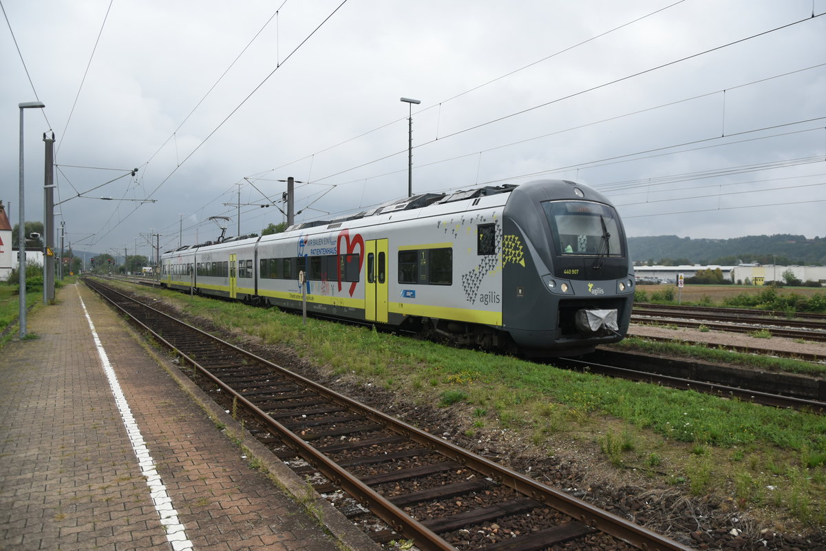 In Neustadt an der Donau fährt gerade ein Agilis 440 102 nach Ingoldstadt Nord ein am Sonntag den 2.9.2018