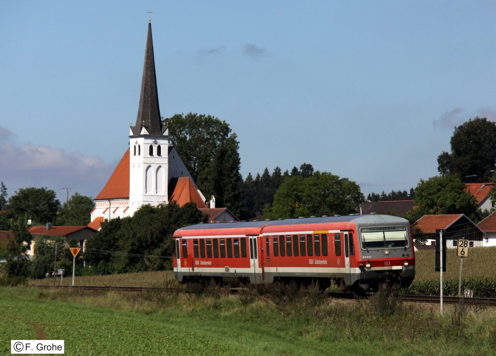 DB 928 626 als RB 27209 Landshut- Rosenheim, KBS 945 Landshut - Mühldorf - Salzburg, fotografiert am 10.09.2011 bei Götzdorf vor Kirche Maria Himmelfahrt Frank Grohe