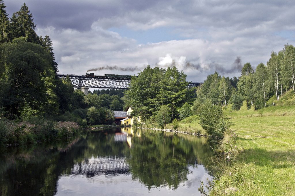 Die Ohebrücke bei Regen ist mit einer Länge von 308 m und einer Höhe von 48 m die zweithöchste Eisenbahnbrücke im Freistaat Bayern (Bauzeit 1872 - 1877). Insgesamt wurden 11300 cbm Gestein für die verwendet, die das Landschaftsbild bis heute prägen. So manch ein Betrachter dürfte sich (trotz der Solaranlage) an die "gute alte Zeit" zurückerinnern, als 70 083 noch planmäßig zwischen Bayerisch Eisenstein und Landshut verkehrte. 11.08.12 Regen Dominik Pfeffer