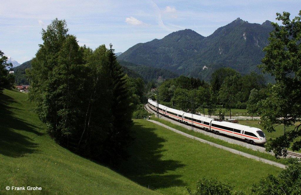 Tag 9: Bei Eschenlohe zwängt sich ICE 583 aus Lübeck (Tz "Saalfeld (Saale)") durch die engen Kurven der Karwendelbahn. Sein Ziel ist in Kürze der Bahnhof Garmisch-Partenkirchen. (20.08.2011) Kevin Schmidt