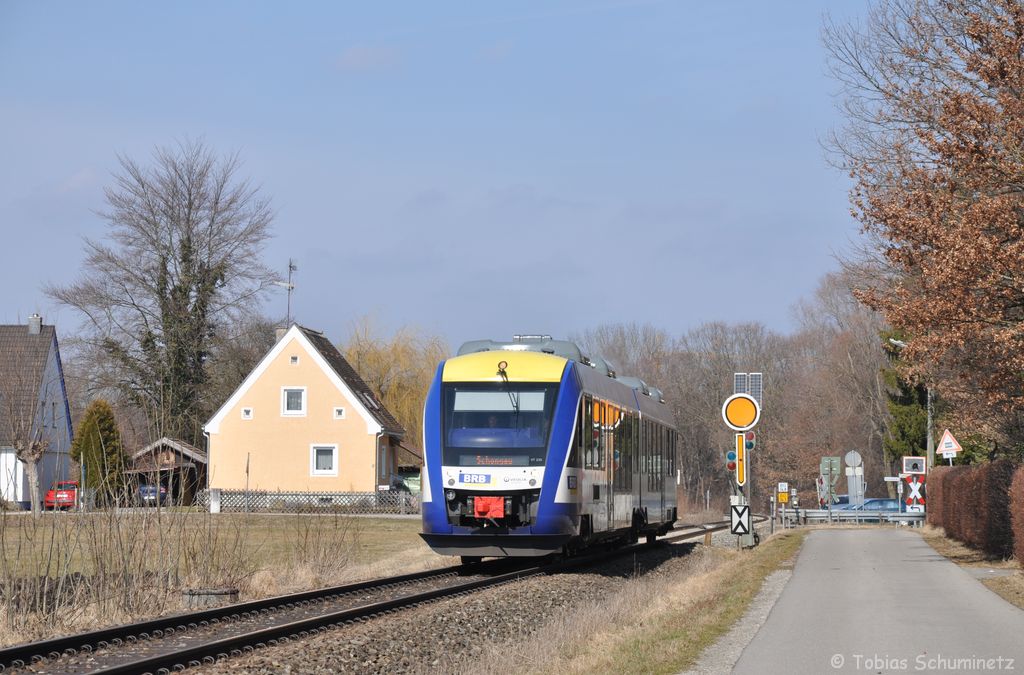 218 472-9 wird mit ihrem RE von München nach Kempten gleich den Lech überqueren, bei Kaufering, 14.04.12