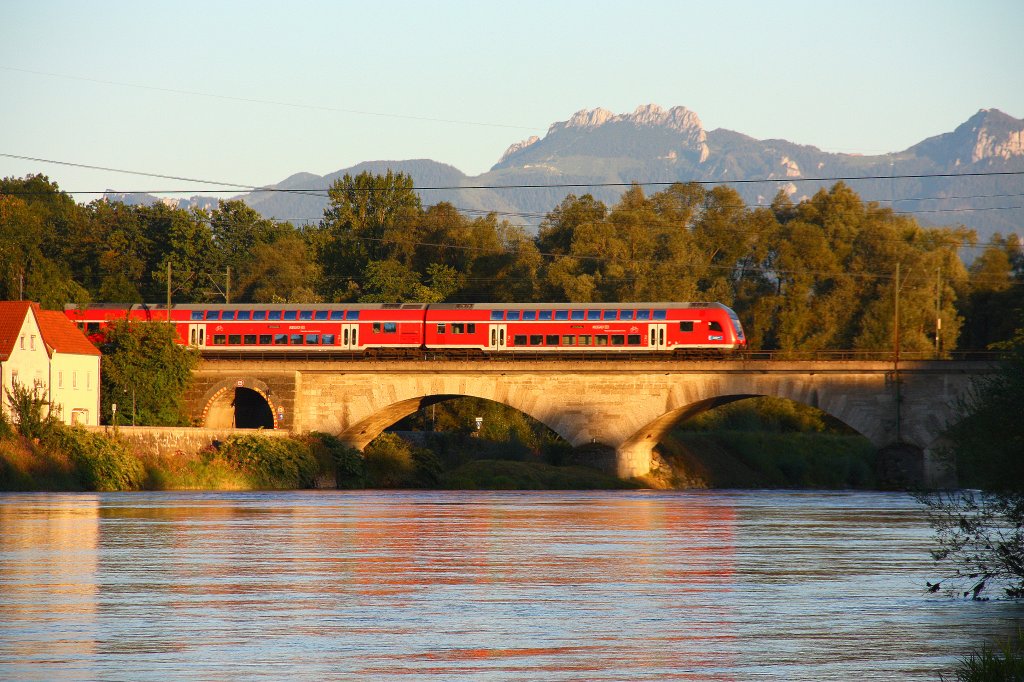 Eine 101 zieht ihren IC im letzten Abendlicht über die Rosenheimer Innbrücke gen Salzburg ( im Hintergrund die Kampenwand ) - 27/08/2012 Rupprecht von Gersdorff