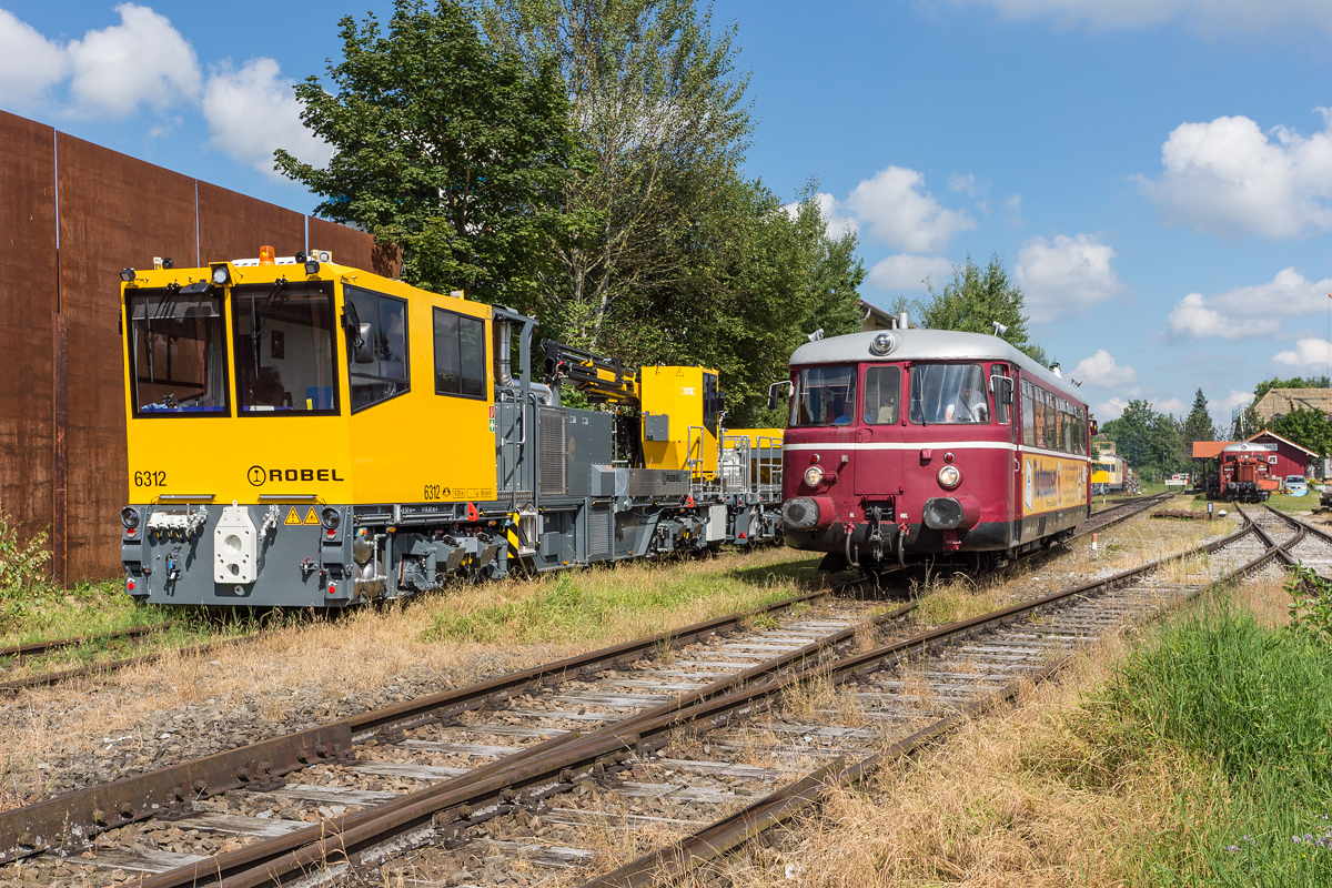 Alt trifft auf neu. Der SKL 6311, gebaut von der Firma Robel in Freilassing, steht kurz vor der Auslieferung an die Kölner Verkehrsbetriebe (KVB). Der VT der Lokalbahhn Endorf - Obing (LEO) pendelt an Wochenenden als Museumszug zwischen diesen beiden Orten. Bahnhof Obing 07.08.2016 Ingo Konrad Müller