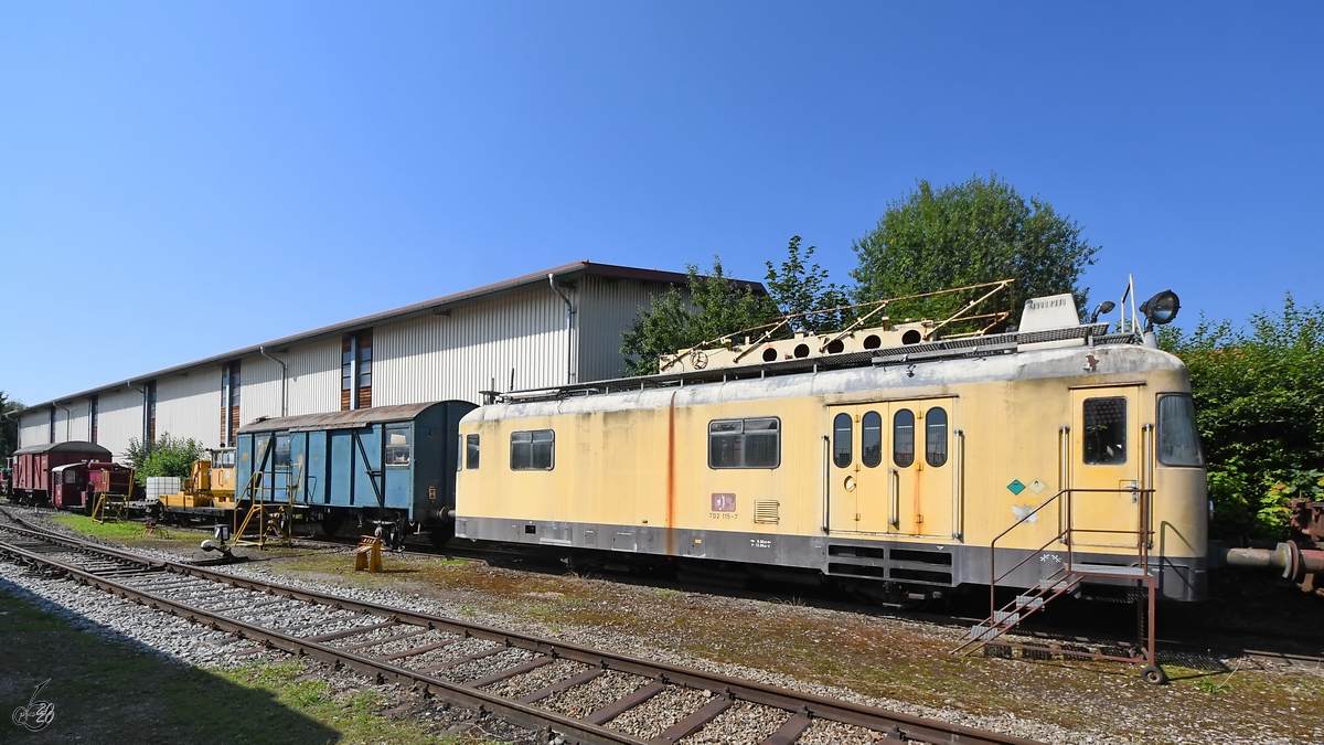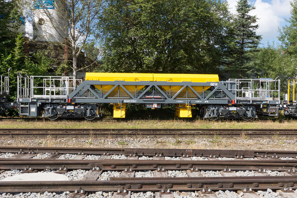 Der neue Schotterwagen, gebaut von der Firma Robel in Freilassing, steht kurz vor der Auslieferung an die Kölner Verkehrsbetriebe (KVB). Zusammen mit SKL 6311, 6312 und 6313 absolvierte er zwei Wochen lang umfangreiche Testfahrten auf der Strecke Bad Endorf - Obing. Die Anwohner dieser Museumsbahn sind nicht an Zugverkehr über die Woche gewöhnt. Daher wurden die Zugfahrten im Verkehrsfunk erwähnt und um besondere Vorsicht an den Bahnübergängen gebeten. Bahnhof Obing, 07.08.2016 Ingo Konrad Müller