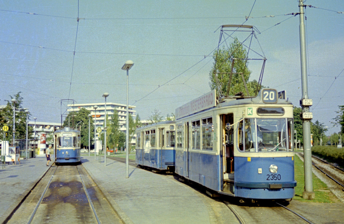 München MVV Tramlinie 20 (M3.64 2350) Cosimapark am 17. August 1974. - Im Hintergrund sieht man undeutlich den Tw M4.65 2496 auf der Linie 9. - Scan eines Farbnegativs. Film: "Alfochrome-Ringfoto" (: Sakuracolor R-100?). Kamera: Kodak Retina Automatic II. Kurt Rasmussen
