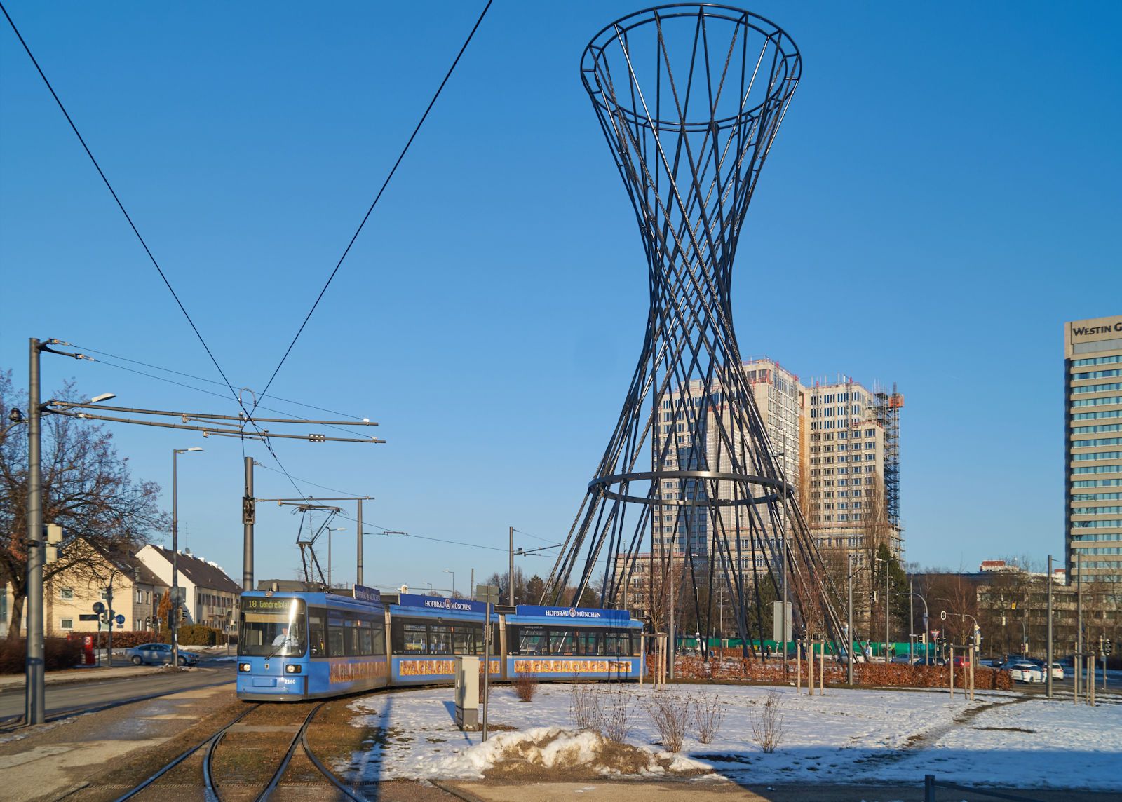 Wirklich prägend ist die Skulptur am Münchner Effnerplatz, welche der Schauspielerin Mae West gewidmet ist. Fast schon klein wirkt dagegen R2.2b 2160, welcher am 29.01.2017 auf Linie 18 zwischen Gondrellplatz und Effnerplatz unterwegs war, in der Schleife wendete. Michael Brunsch