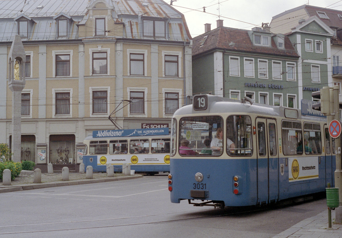 München MVV Tramlinie 19 (p3.17 3031 + P3-16 20xx) Pasing, Marienplatz im Juli 1992. - Einige werden vielleicht diese Aufnahme für misslungen halten. Ich habe aber das Bild hochgeladen, um die nicht ganz übliche Lage der Wendeschleife am Pasinger Marienplatz, der selber Raum für die Schleife gibt, zu veranschaulichen. - Auf dem Platz wurde 1880 die Säule mit der Marienfigur (links) aufgestellt. Wegen des Verkehrs wurde das Monument 1908 abgebaut und erst 1980 wieder aufgestellt. - Scan eines Farbnegativs. Film: Kodak Gold 200-3. Kamera: Minolta XG-1. Kurt Rasmussen