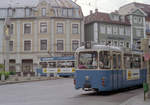 München MVV Tramlinie 19 (M5.65 2614 + m5.65 3512) Pasing, Marienplatz im Juli 1992. - Das Bild zeigt die M5+m5-Garnitur in der Wendeschleife am Pasinger Marienplatz. Zu der Zeit hatte die Linie 19 am Marienplatz ihre Endstation, und der Platz selber gab für die Wendemöglichkeit Raum. - Scan eines Farbnegativs. Film: Kodak Gold 200-3. Kamera: Minolta XG-1. Kurt Rasmussen