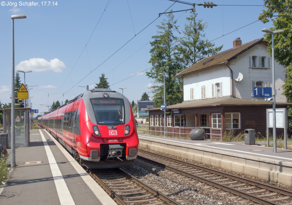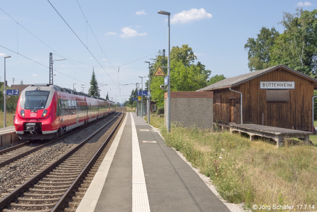 7 Jahre nach Bild-ID 870309 hatte sich in Buttenheim nicht viel verändert, nur die schmalen Bahnsteige waren auf 76 cm erhöht worden. 442 234 hielt als S-Bahn Richtung Nürnberg auf Gleis 2. (Blick nach Norden am 17.7.14) Jörg Schäfer