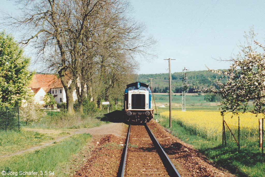 Lange Jahre kreuzte der Güterzug nach Marolds¬weisach in Baunach einen Personenzug nach Bamberg. Am 3.5.94 traf die solo fahrende 360 241 dabei auf einen von 211 056 gezogenen Sandwichzug.
