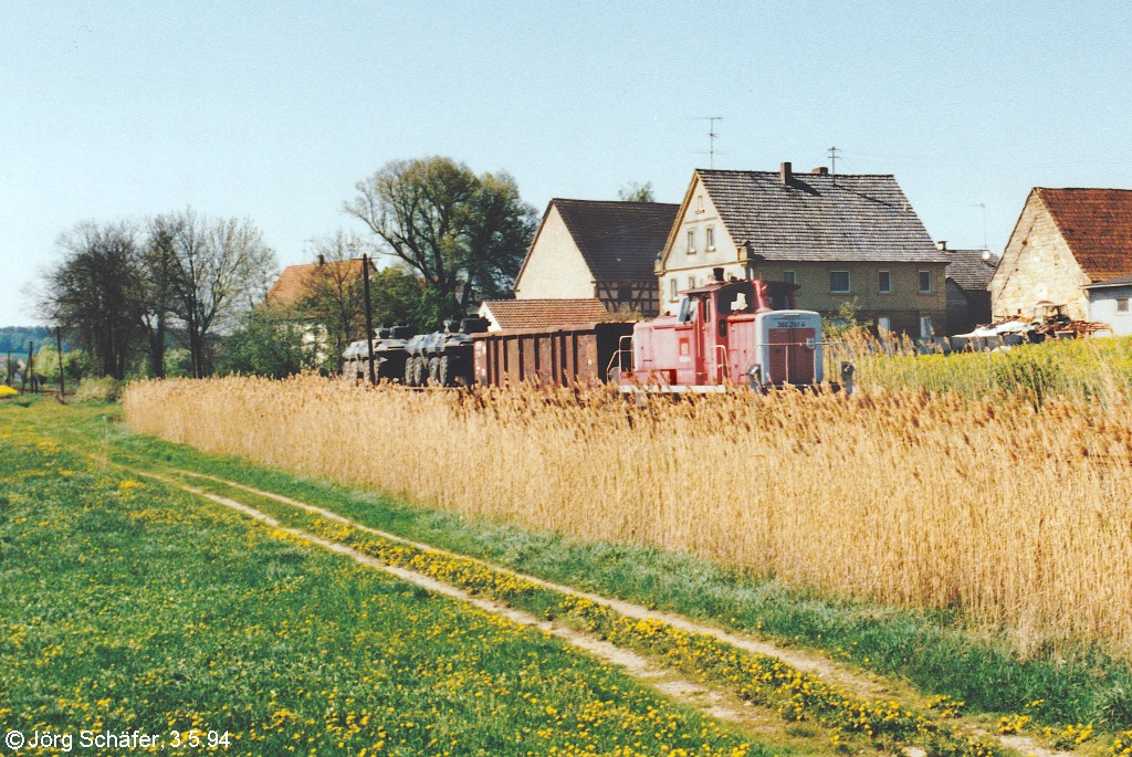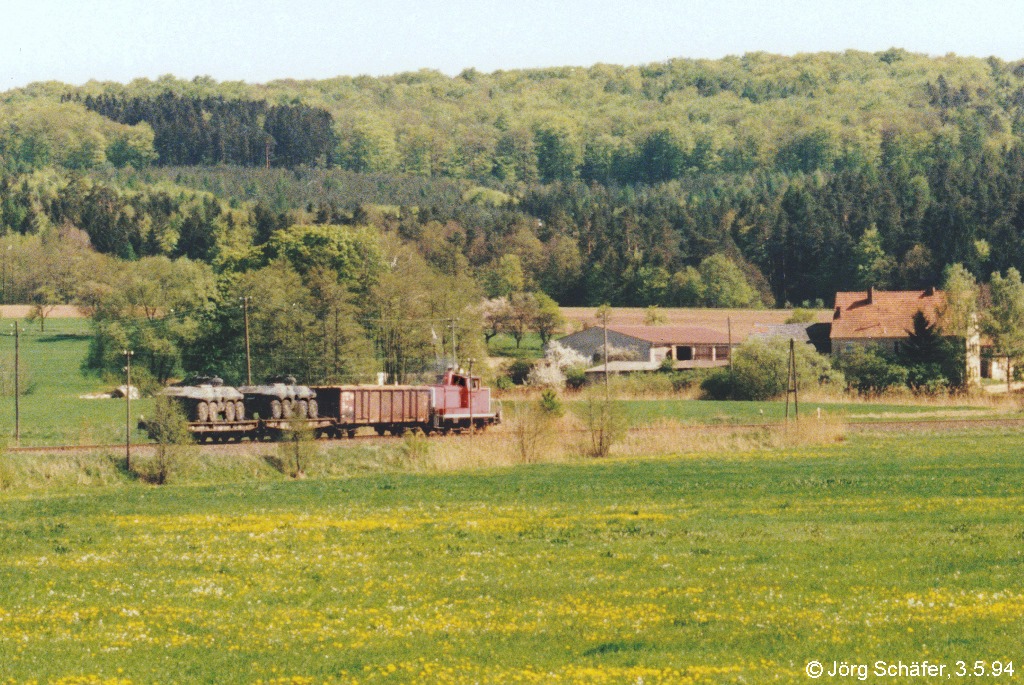 360 241 war am 3.5.94 mit ihrem Güterzug nach Bamberg zwischen Manndorf und Reckendorf unterwegs. Am Schluss zwei Panzer aus der Eberner Balthasar-Neumann-Kaserne.
