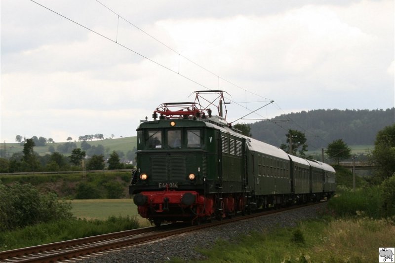 Am 20. Juni 2009 fand bei der Modellbahnfirma Piko wieder ein Tag der offenen Tür statt. Aus diesen Anlass kamen mehrere Sonderzüge nach Sonneberg. Auch E44 044 des Ausbesserungswerks Dessau  war im Auftrag des Eisenbahnmuseums Leipzig an diesem Tag mit einen historischen Personenzug auf den Weg nach Sonneberg. Das Bild entstand kurz nach 13 Uhr am Bahnübergang in Haarbrücken bei Neustadt bei Coburg.