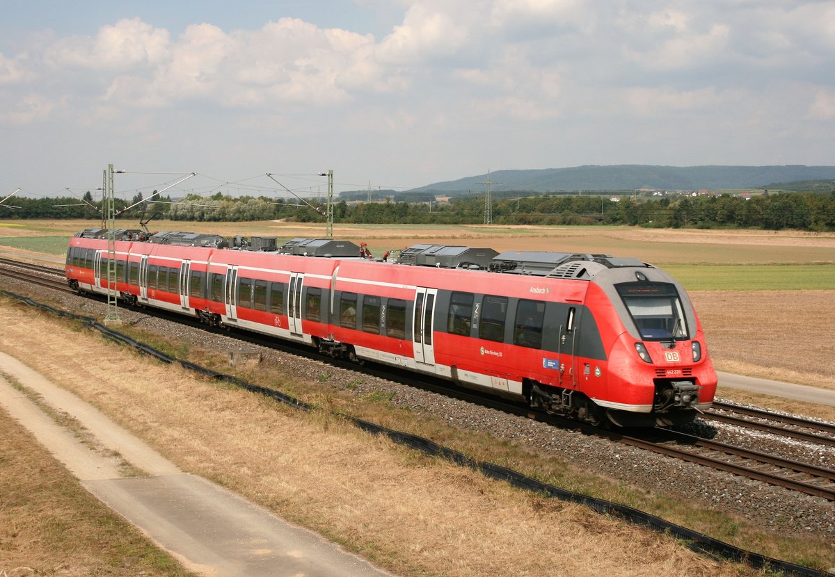 7 Jahre nach ID 869237 wirkte der Bahnhof Eggolsheim rundum erneuert. Der erste Eindruck täuscht aber, denn außer den Bahnsteigen blieb alles beim alten: Im Empfangsgebäude saß immer noch ein Fahrdienstleiter, der die Formsignale stellte und den Bahnübergang sicherte.(442 773 am 17.7.14 als S-Bahn nach Bamberg.) Jörg Schäfer