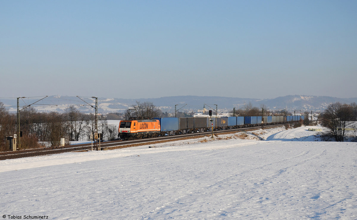 193 224 von WLC befährt am 30. November 2019 mit einem Containerzug die KBS 880 in Richtung Nürnberg. Die Aufnahme entstand zwischen Pölling und Postbauer-Heng. Laufradsatzlageröler