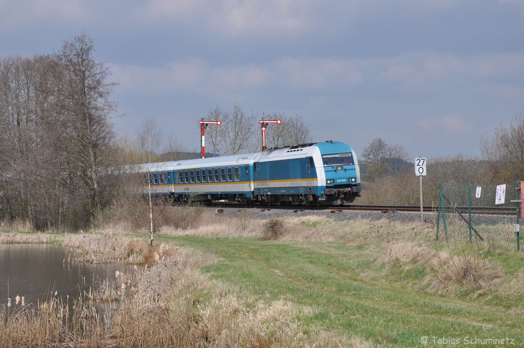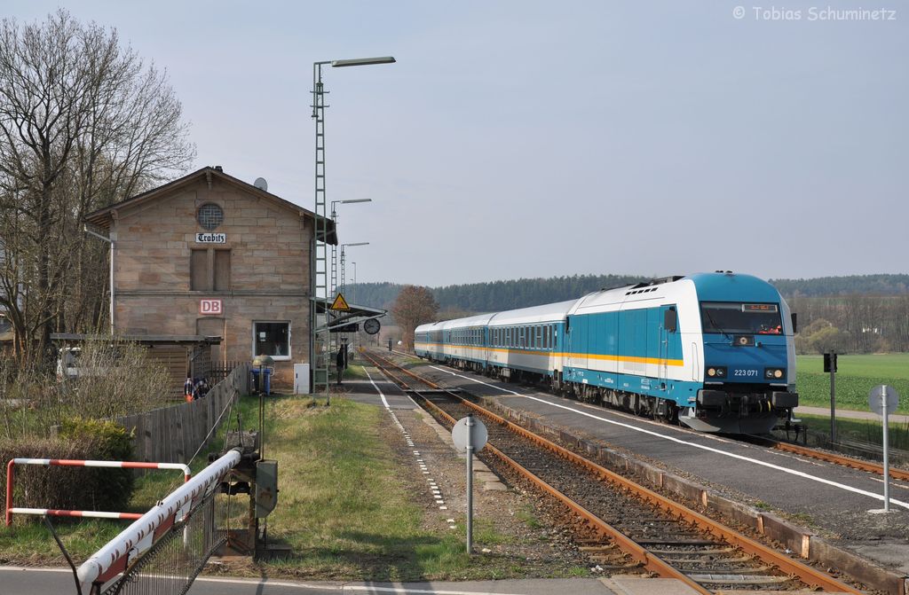 38 3101 mit Reisezug bei der Ausfahrt aus Trabitz am 16.04.2011