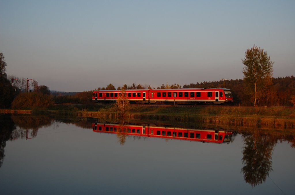 Ein 628 als RB 32037 am 14.10.2010 im letzen Licht des Tages bei der Einfahrt in Trabitz