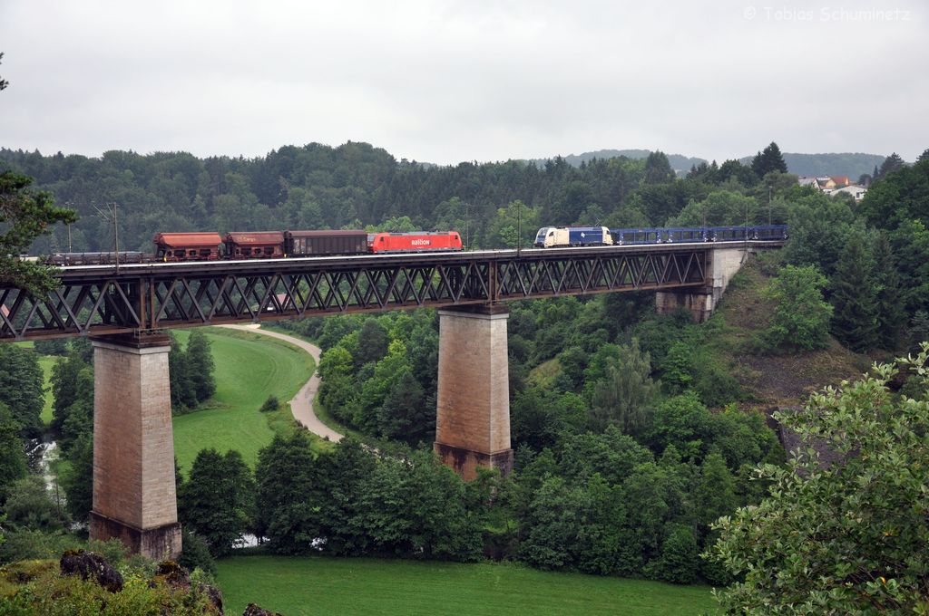 zwei unbekannte Loks treffen am 04.07.2012 auf dem Laaberviadukt bei Beratzhausen aufeinander.