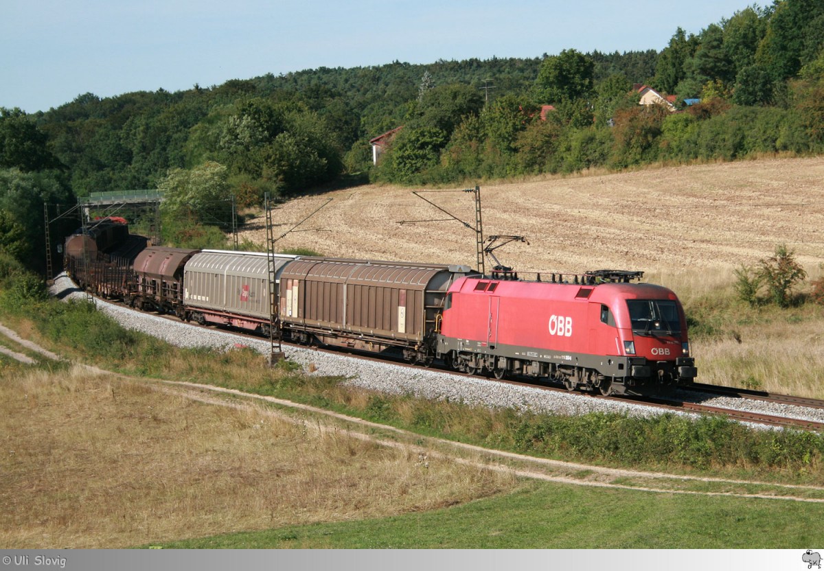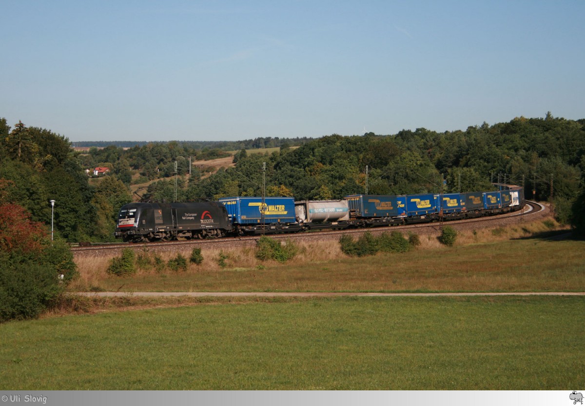 ES 64 U2 - 010 der MRCE, angemietet von TX Logisik, befördert am 26. August 2015 einen Güterzug zwischen Nürnberg und Regensburg. Die Aufnahme entstand in der Nähe der Ortschaft Laaber. Ulrich Slovig