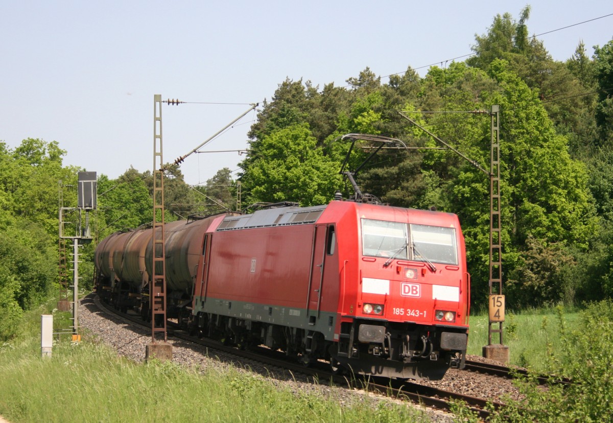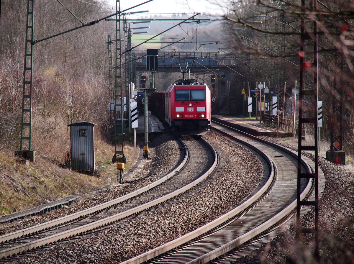 Mit einem einheitlich aus Waggons des Schweizer Unternehmens Wascosa gebildeten Kesselwagenzug war am Abend des 03. April 2025 die 187 327 der HGB bei Laaber in der Oberpfalz westwärts unterwegs. Beim Blick von oben wird einem die Größe der Stützmauer veranschaulicht. Christoph Schneider