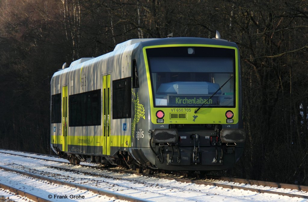"gestreifter" AGILIS VT 650 705 als ag 84522 Marktredwitz - Kirchenlaibach, KBS 860 Hof / Cheb - Nürnberg, fotografiert bei Immenreuth am 11.02.2012 --> Die genau in diesem Moment über den Bergen des Fichtelgebirges aufgehende Sonne wirft die Schatten der Bäume auf den Triebwagen. Frank Grohe