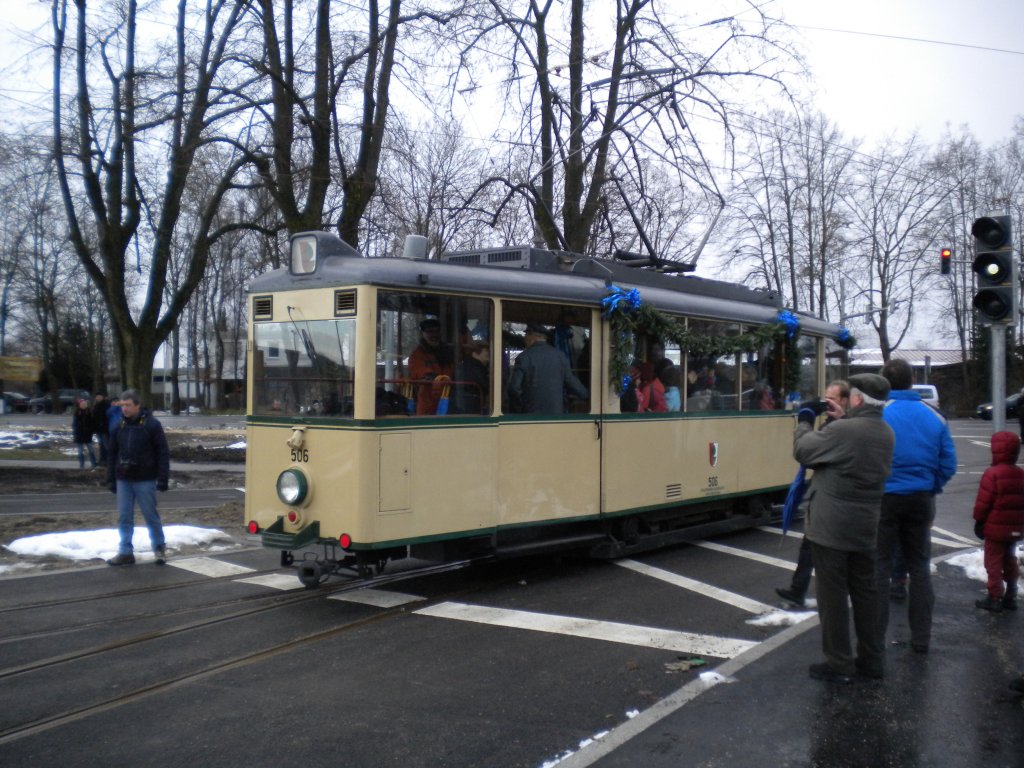 Eröffnung der neuen Straßenbahnlinie 6 (Hauptbahnhof - Königsplatz - Textilmuseum - Hochzoll - P&R Friedberg West) am 12. Dezember 2010. Nach 50 Jahren 'Pause' kehrt die Linie 6 ins Augsburger Straßenbahnnetz zurück. Bereits zwischen 1920/34 und 1960 verband die alte 'Sechser' das Stadtzentrum mit dem Textilviertel und Hochzoll. Hier Triebwagen 506 (KSW, 'Heidelberger'), Bj. 1948 als Oldtimerfahrzeug auf Sonderfahrt an der Endhaltestelle 'P&R Friedberg West'.