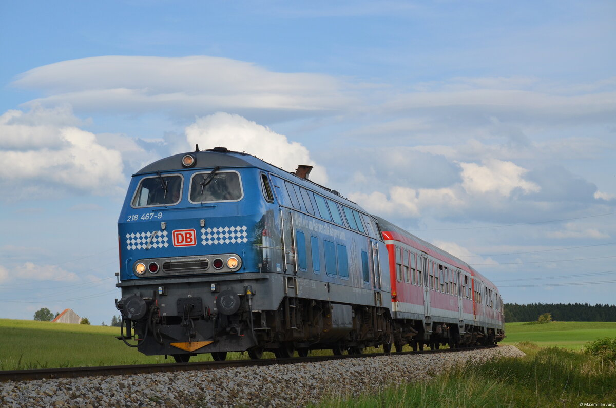 Leider spielte das Wolkenlotto am 21.08.2014 mir nicht in die Karten: Während die hinteren Wagen noch in der Sonne sind, zeigte sich 218 467 mit ihrer Sonderbeklebung für das Bayern-Ticket schon im Schatten.