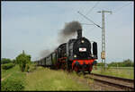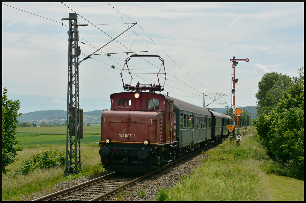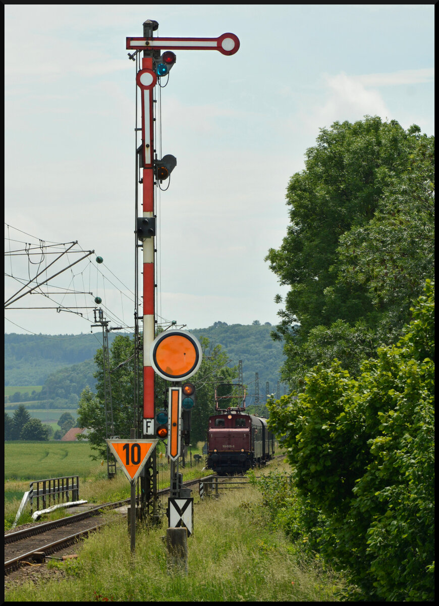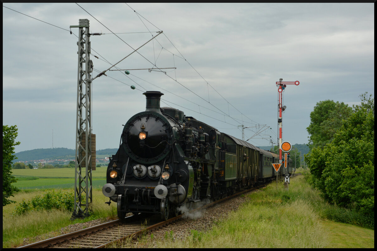 BUCHLOE (Landkreis Ostallgäu), 28.04.2025, ein offensichtlich nicht mehr für die Personenbeförderung geeigneter Zug bei der Durchfahrt durch den Bahnhof Buchloe (nach Durchsicht einiger Kategorien könnte es sich evtl. auch um einen Messzug handeln) Reinhard Zabel