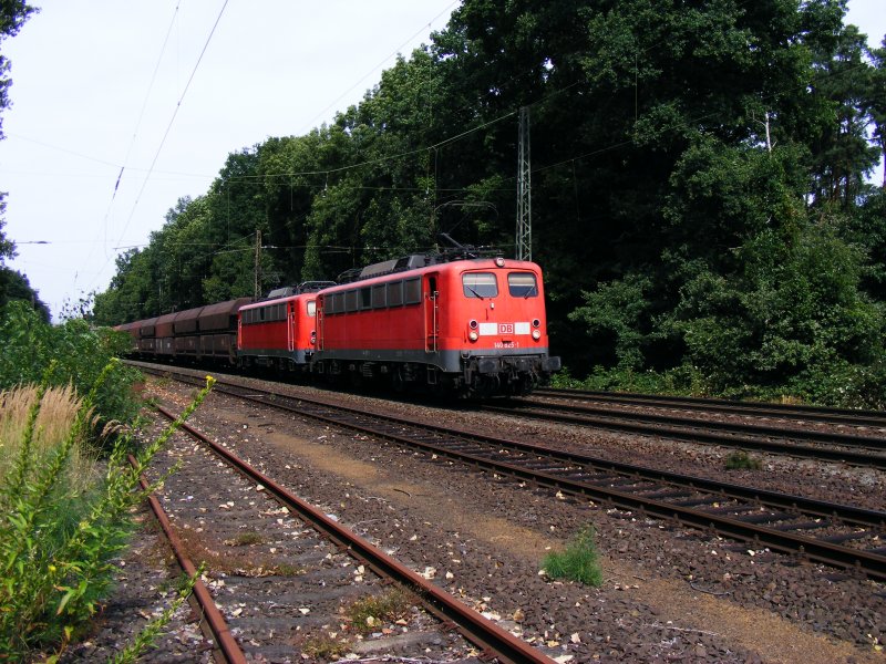 Die Schranke war unten. Dann kam 140 825 + 140 xxx mit 2.200t-Erz-Gag nach Linz (Donau). Zwischen Frankurt und Aschaffenburg_Aug 2008 Wolf-Hergen van Geelen