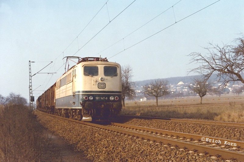151 147-6 mit Güterzug Richtung Aschaffenburg, aufgenommen am 25.2.1979 bei Kleinostheim. Bildüberarbeitung: Ralf Mayer.