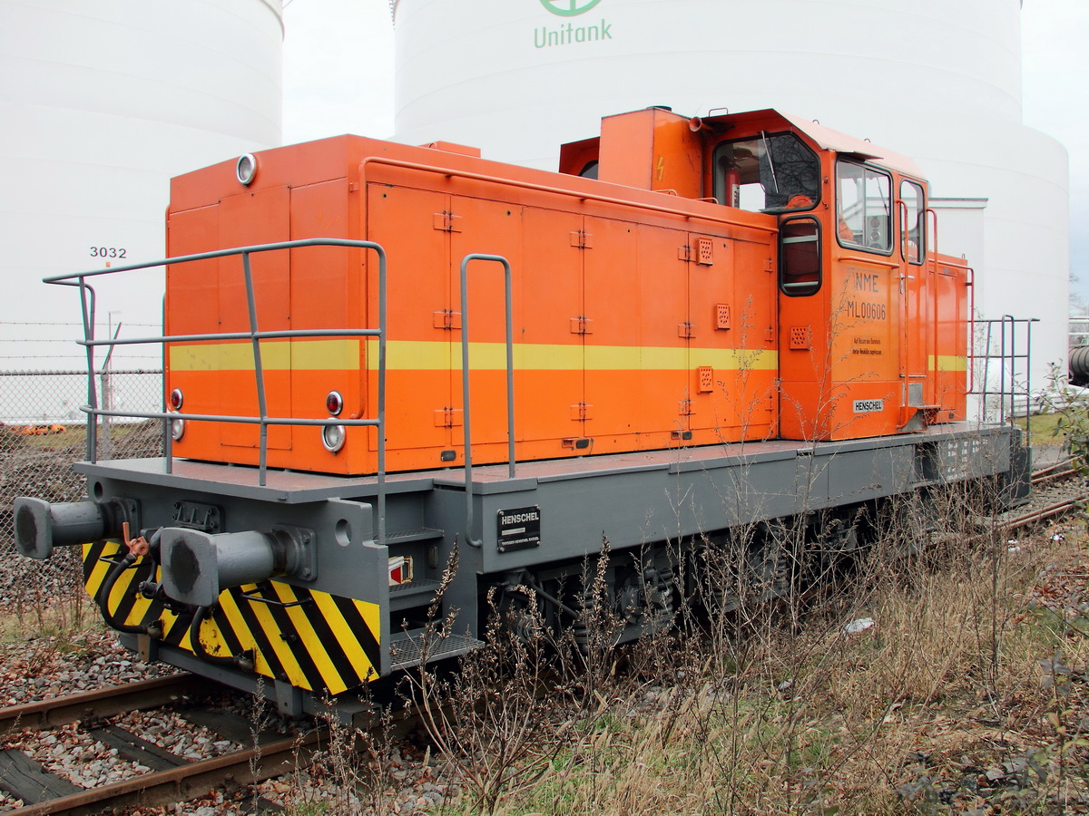 Die von Stinnes erworbene Hentschel Diesellok ML 00606 der Neukölln - Mittenwalder Eisenbahn-Gesellschaft AG (NME) steht vor der verschlossenen Einfahrt des Tanklager am Teltowkanal im Bezirk Berlin Rudow am 23. April 2014. Klaus-P. Dietrich