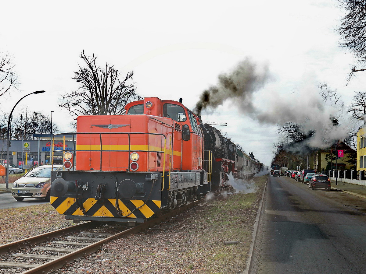 Nachschuss auf den Sonderzug der Dampflokfreunde Berlin e.V. mit 52 8131-6 als Schublok der WFL am 17. März 2018 in Berlin Rudow, Stubenrauchstraße.