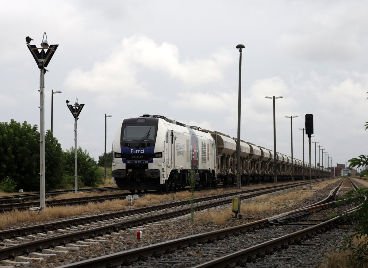 EVU HHPI hat hier Stadler Eurodual Zweikraftlok 9080 2159 202-1 "F=ma " eingestellt, vor einen Sandganzzug in Mühlberg. 01.08.2021 12:41 Uhr. Siegfried Heße