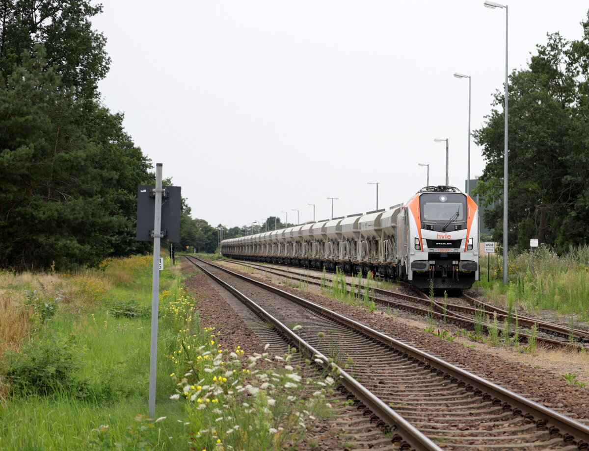 Eine Lok des EVU HVLE, eine Hybrid Lok gebaut bei Stadler mit einem Ganzzug, auf Ausfahrt wartend auf den Gleisen des Kieswerkes Mühlberg. 01.08.2021 09:46 Uhr.